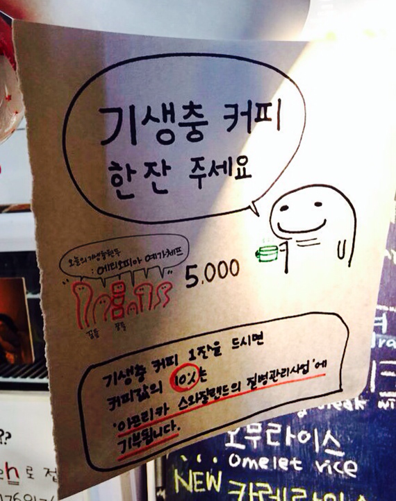 우리는 해가 지면 추워지는 창가 자리를 피해 따뜻한 난로 근처에 앉았다. 함께 메뉴를 찬찬히 살펴보다 나는 ‘기생충 커피’ 라는 흥미로운 이름을 발견했다. 머그컵을 들고 있는 벌레 그림이 정말 귀여워서 나는 고민할 것도 없이 기생충 커피를 주문했다. 그리고 조그만 글씨로 메뉴판에 적힌 글을 통해 기생충 커피라는 다소 특이한 이름의 의미를 알게 되었다. 판매수익금은 아프리카 스와질랜드의 질병관리사업에 기부되며, 나는 한 잔의 커피를 마심으로써 기생충으로 인한 질병으로 고통 받는 제 3세계 사람들을 돕게 된다. 기부되는 금액은 커피가격의 10%로 한 잔에 500원 밖에 되지 않는 작은 금액이긴 하지만 말이다.