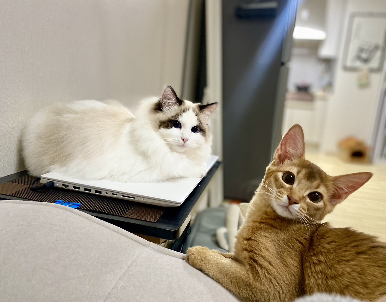 내 친구는 고양이와 함께 산다. 첫째는 달래. 둘째는 지니다. 합쳐서 진달래. 랙돌과 아비시니안인데 둘이 꼭 솜사탕과 쿠키 같다. 쓰다듬고 있으면 가끔씩 달콤한 향이 나는 것 같은 느낌이 든다. 달래는 순하고 점잖은 성격이다. 곧 한 살인데 하악질 하는 모습을 본 적이 없다. 어렸을 때는 손이나 발을 무는 장난을 좋아했지만 지금은 차분하고 어른스럽다. 길고 풍성한 털이 꼭 중세시대 왕이 입던 대관복 같다. 지니는 정말 활발하고 호기심이 많다. 놀아주면 30분 내내 여기저기 뛰어다닌다. 두 아이들의 성격은 판이하게 다르지만 사람을 좋아한다.