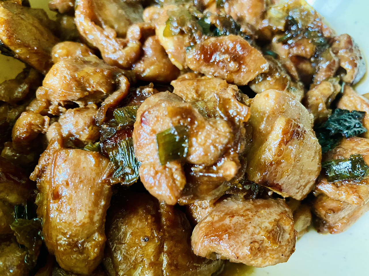 달콤한 과일향이 맛있는 소리를 내면서 고기에 스며든다. 센 불에서 빠르게 볶다 불을 낮추고 간장양념을 추가한다. 윤기가 도는 예쁜 갈색이 될 때까지 약불로 졸인다. 간장베이스 조림은 와인이나 위스키를 넣으면 풍미가 살아난다. 술은 훌륭한 조미료다. 취향차이겠지만 마시는 것보다 요리할 때 첨가하는 편이 낫다. 가격이나 등급을 막론하고 위스키는 도토리 냄새가 난다. 달달한 과일 향이나 매캐한 탄내를 비롯한 다채로운 향미가 감돌지만 결국 도토리 맛이다.