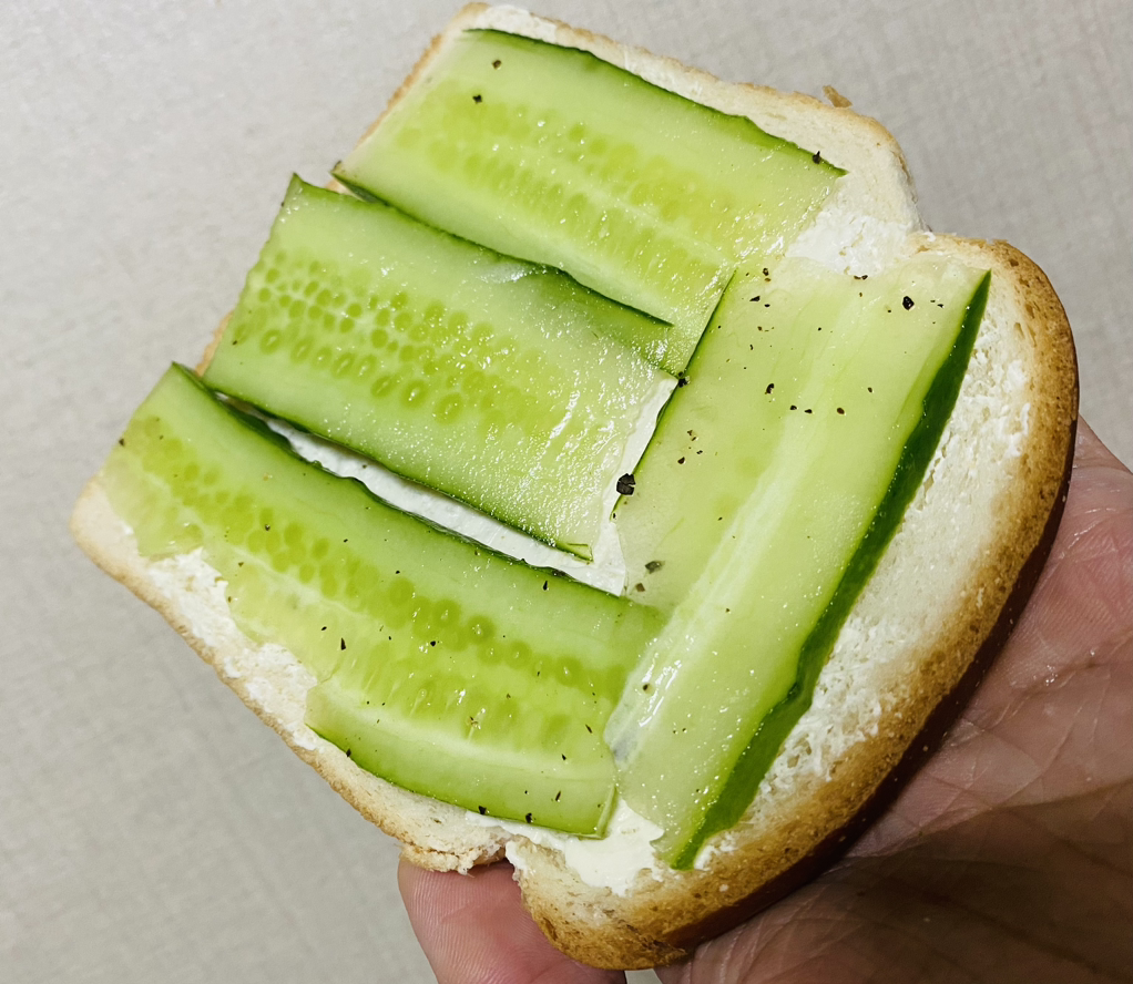채칼 대신에 과도를 사용해서 오이를 얇게 잘랐다. 간단한 요리는 가위와 과도만 있으면 된다. 얇게 썬 오이에 으깬 통후추와 맛소금을 뿌려서 밑간을 한다. 달군 팬에 식빵 세 쪽을 넣고 한쪽 면만 살짝 굽는다. 접시에 빵을 올리고 크림치즈를 바른 후에 오이를 얹으면 완성. 간단하고 맛있는 오이샌드위치다. 크림치즈 대신에 올리브유나 명란마요네즈를 첨가해도 된다. 오이는 기름기 있는 소스와 궁합이 좋은 채소다. 고소한 빵과 수분감 있는 오이가 기분 좋게 어우러진다.