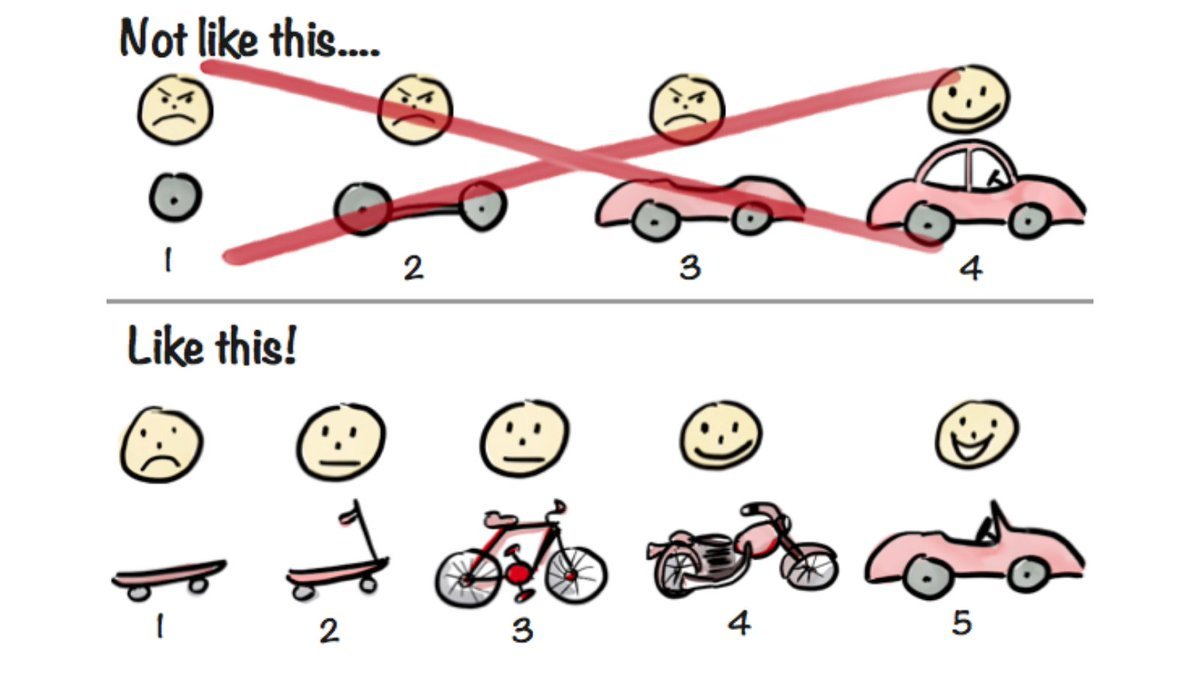 반대로 Like this 그림에서는 1번부터 '탈 것'이라는 가치를 갖는다. 단계를 거듭하며 전달할 가치 플로우는 변한다. 하지만 각 단계별로 가치 있는 무언가를 만들고 있다는 사실은 흔들리지 않는다.