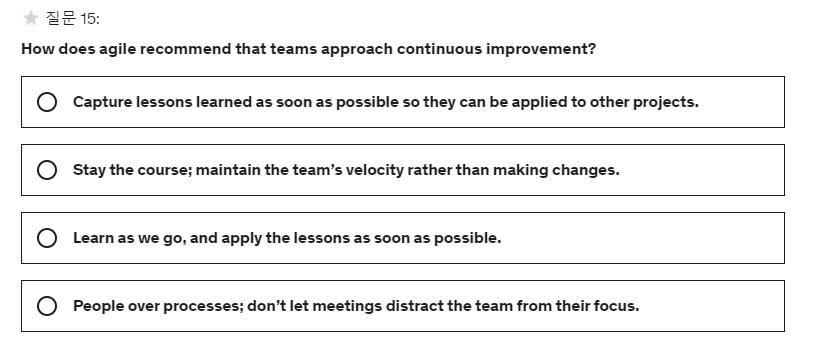 다른 옵션도 모두 말이 될 수 있지만 애자일팀의 주요 초점은 지속적 개선을 위해 계속 배우고 얻어진 교훈이 적절하게 적용 가능 시점에 빠르게 적용하도록 한다.