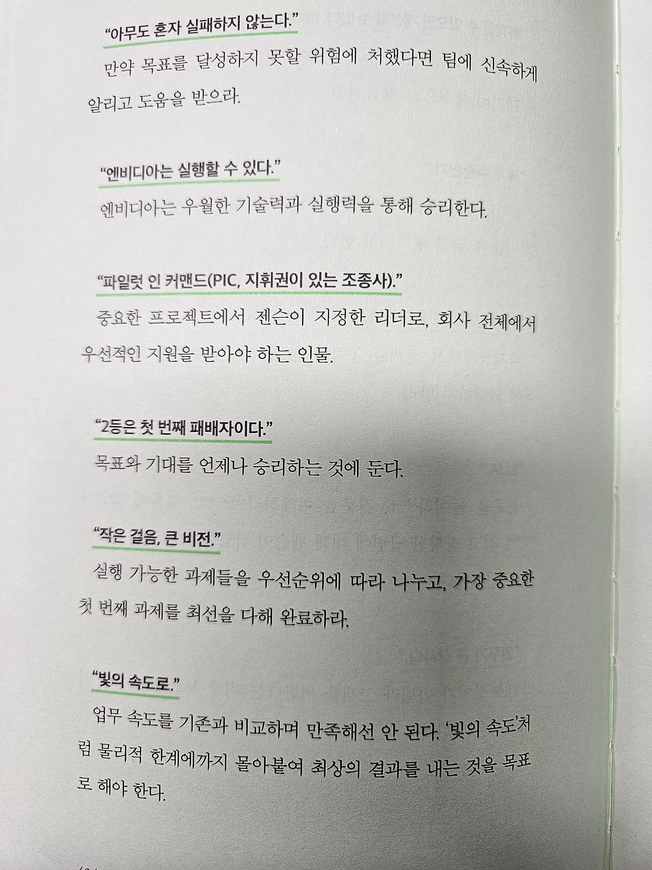 이 책을 읽다 보면 주 80시간 이상을 일로 시간을 보내고 끊임없이 시장을 파악하며 NVIDIA가 IT 산업에서 살아남으려고 노력하는 모습이 NVIDIA를 최고의 IT 회사로 만들었다는 느낌을 받는다.