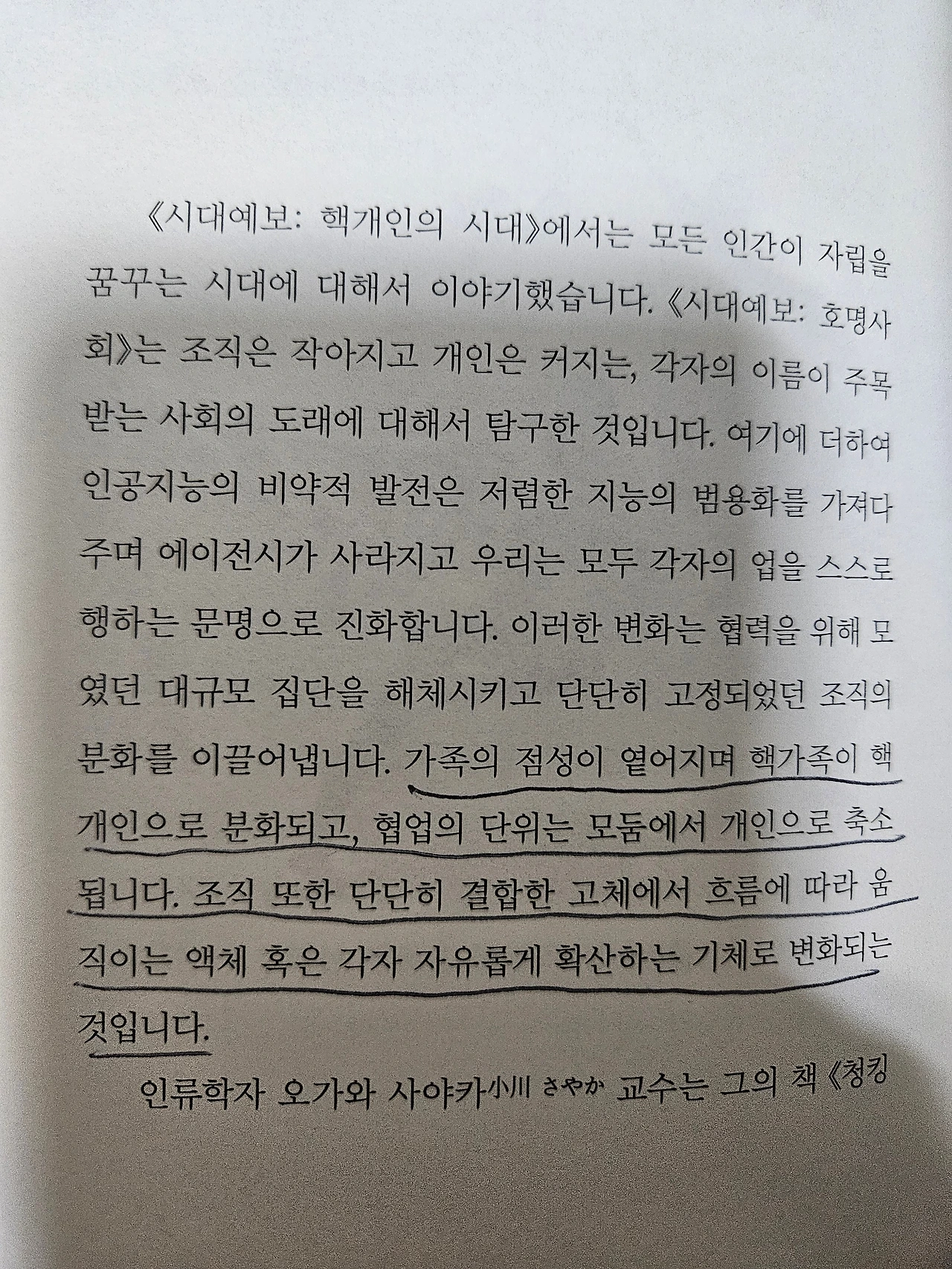 농경사회에서는 집단 활동이 필수였고, 산업화 시대에는 조직 내 분업화를 통한 협동이 성장의 핵심이었다. 하지만 지금은 스마트폰 하나로 혼자서 할 수 있는 일이 무궁무진하며, 노마드의 삶을 살아가면서도 사회생활이 가능한 기동력이 생겼다. AI 시대가 되면서 지식은 AI로부터 얻고, AI 에이전트가 직원을 대체하는 일까지 벌어지고 있다.