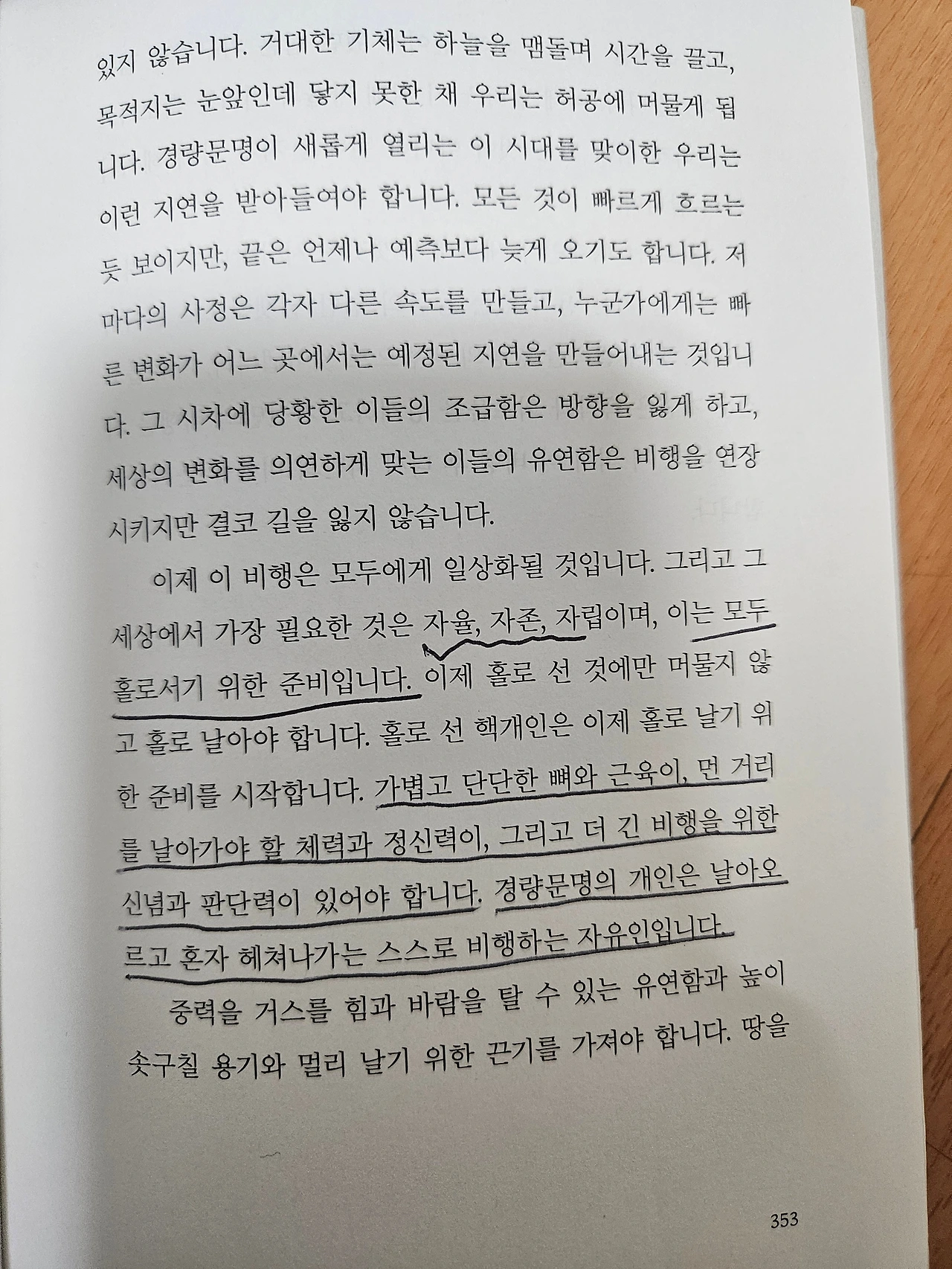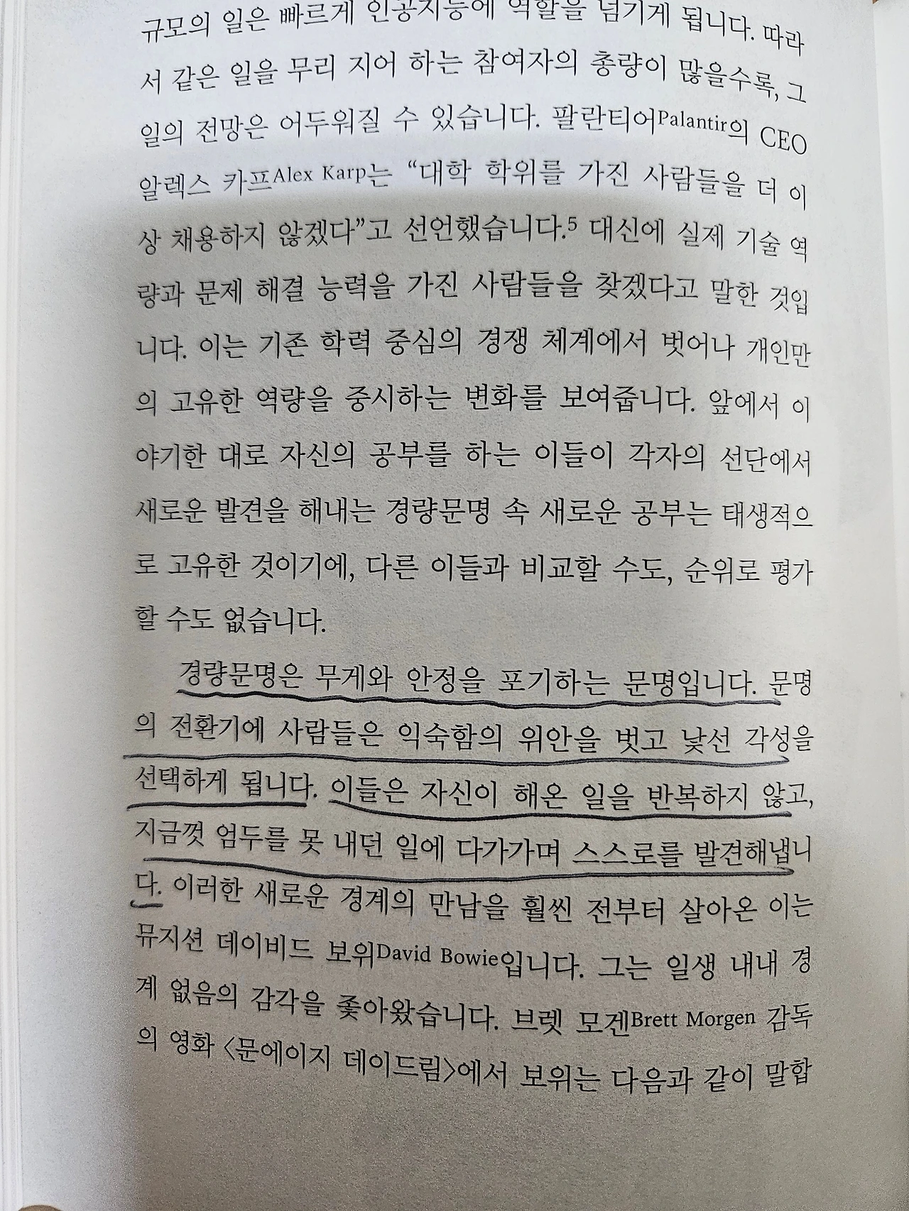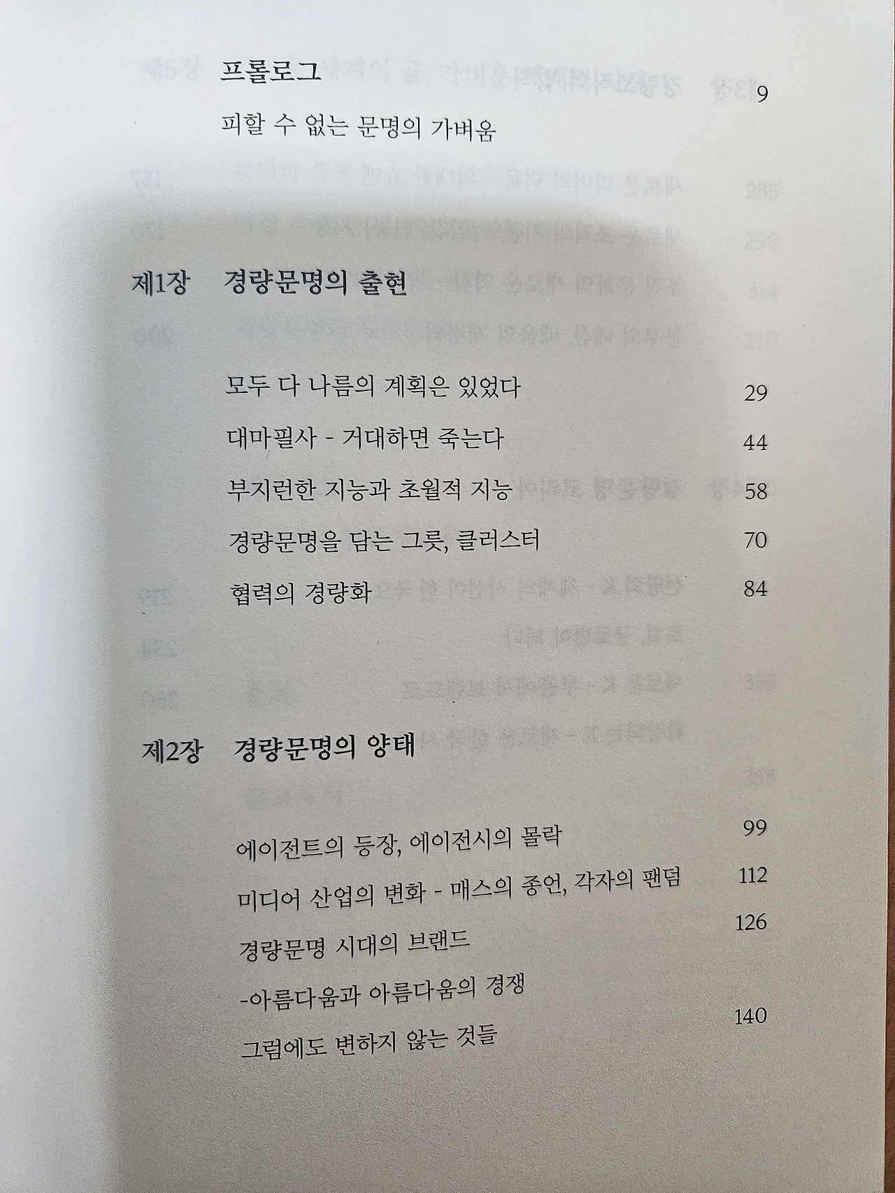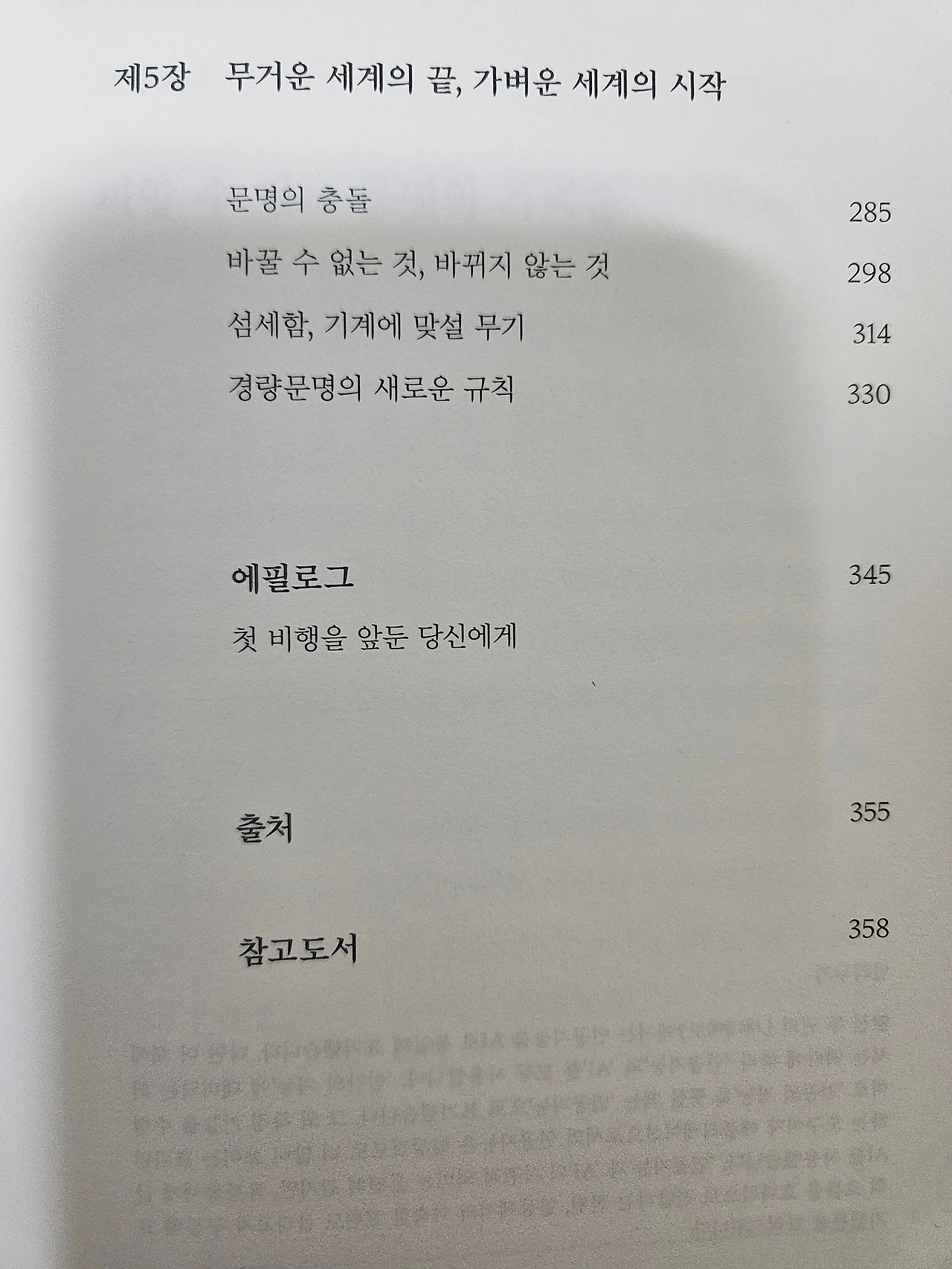 경량은 단순히 무게의 문제가 아닙니다. 가치 체계의 재구성이고, 관계 방식의 혁신입니다. 무엇보다, 지속 가능성을 향한 설계입니다. 더 적게 소유하고도 더 넓게 연결되는 삶, 덜 복잡하지만 더 깊이 있는 질서, 무엇보다 서로에게 덜 바라며 더 위하는 자세, 이것이 경량문명의 언어입니다. 사람이 만든 기술이 구조를 가볍게 만들고, 사람의 지혜는 의미를 더합니다. 그렇게 우리는 무거운 세계의 질곡을 넘어 더 가벼운 문명으로 향하고 있습니다.<시대예보_경량문명의 탄생, 송길영 저>