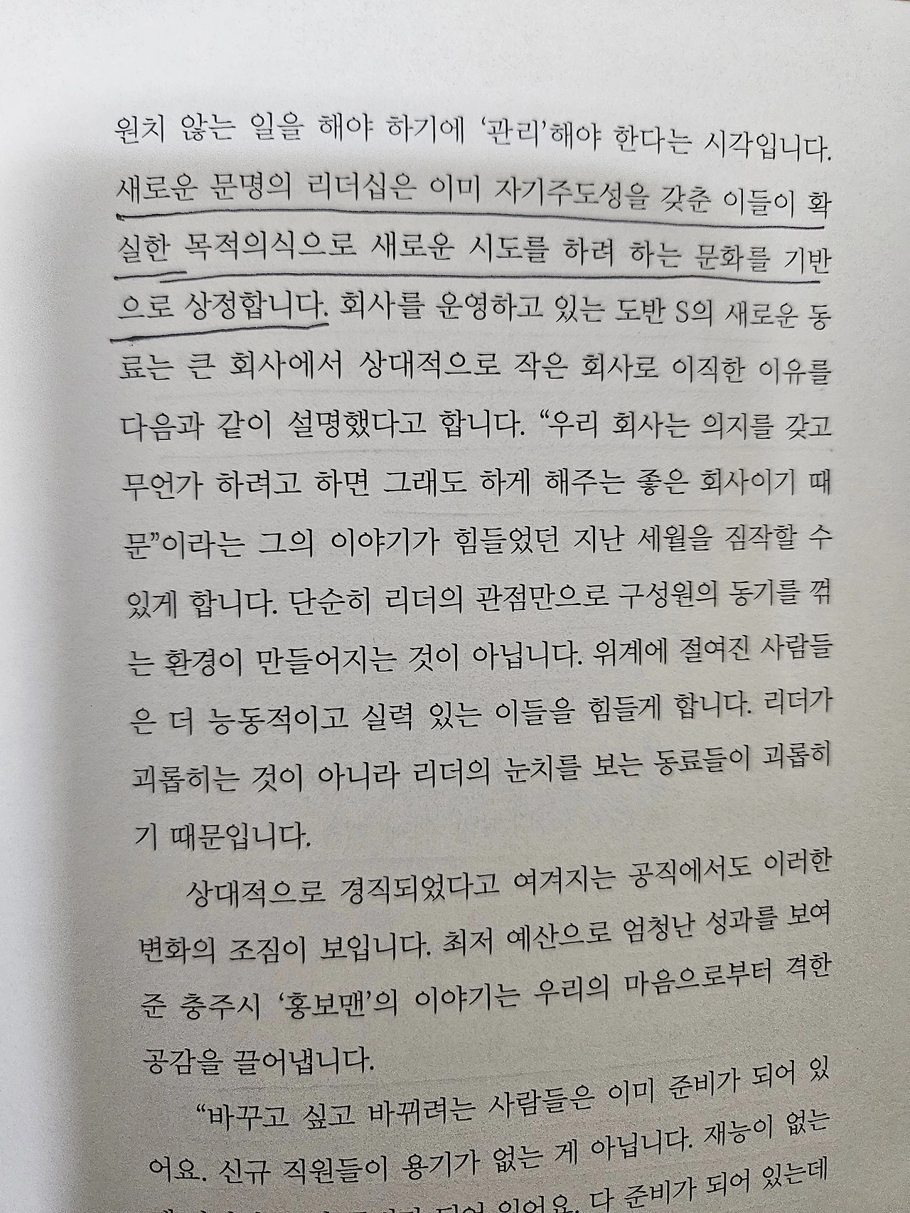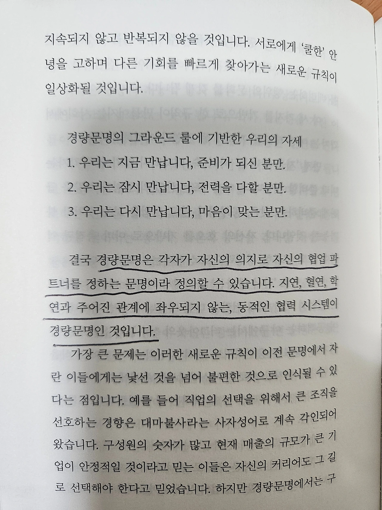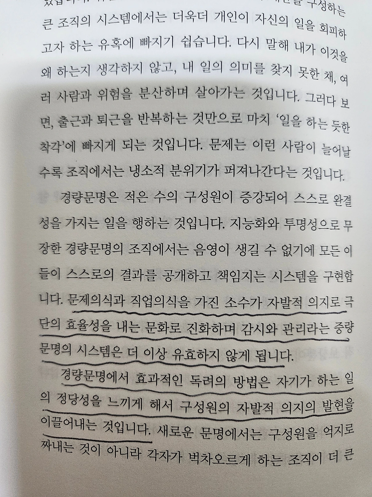 경량문명은 적은 수의 구성원이 증강되어 스스로 완결성을 가지는 일을 행하는 것입니다. 지능화와 투명성으로 무장한 경량문명의 조직에서는 음영이 생길 수 없기에 모든 이들이 스스로의 결과를 공개하고 책임지는 시스템을 구현합니다. 문제의식과 직업의식을 가진 소수가 자발적 의지로 극단의 효율성을 내는 문화로 진화하며 감시와 관리라는 중량문명의 시스템은 더 이상 유효하지 않게 됩니다.<시대예보, 경량문명의 탄생_송길영 저>