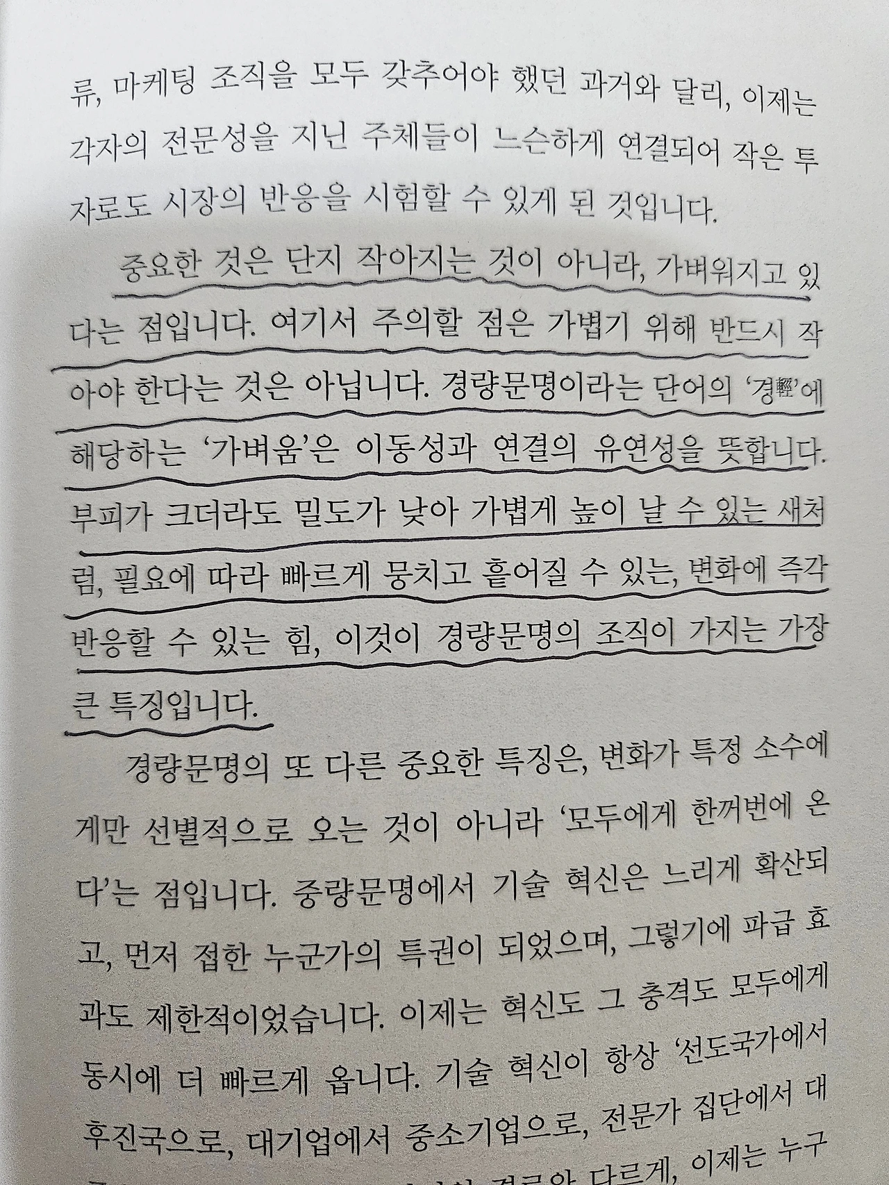 경량문명이 도래한 지금, 사회는 그에 맞게 변화하고 있으며 기업의 모습도 달라질 수밖에 없다. 과거의 고정된 조직 형태는 유연하고 빠르게 변화를 추구할 수 있는 구조로 전환되어야 한다. 변화를 수용하지 못하는 기업은 급격히 경쟁력을 잃게 된다.