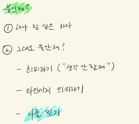 정리하자면, 불안감을 이기려면 게으르게 있지 말고 해야 할 일을 끝내고. 남은 시간에는 나를 쪼아댈 것이 아니라 응원도 한 번씩 해주고. 그런데도 불안하면 다시 할 일을 보충하고 다시 힘도 불어넣어주고. 반복해야 하지 않을까.