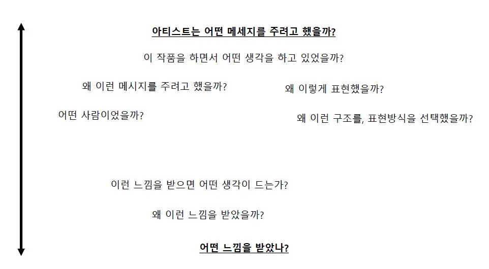 질문을 던져 궁금증을 만들고 대답하면서 내 생각을 구체화해가는 것이야말로 예술을 즐기는 방법이었다. 작가가 도대체 왜 그것을 이렇게 표현하려 했으며, 무엇을 생각했고, 그렇게 된 경위는 무엇이며... 등등. 어렴풋이 생각하던 이해 방법을 저 인스트럭션이 손에 잡히도록 구체화해주었다.