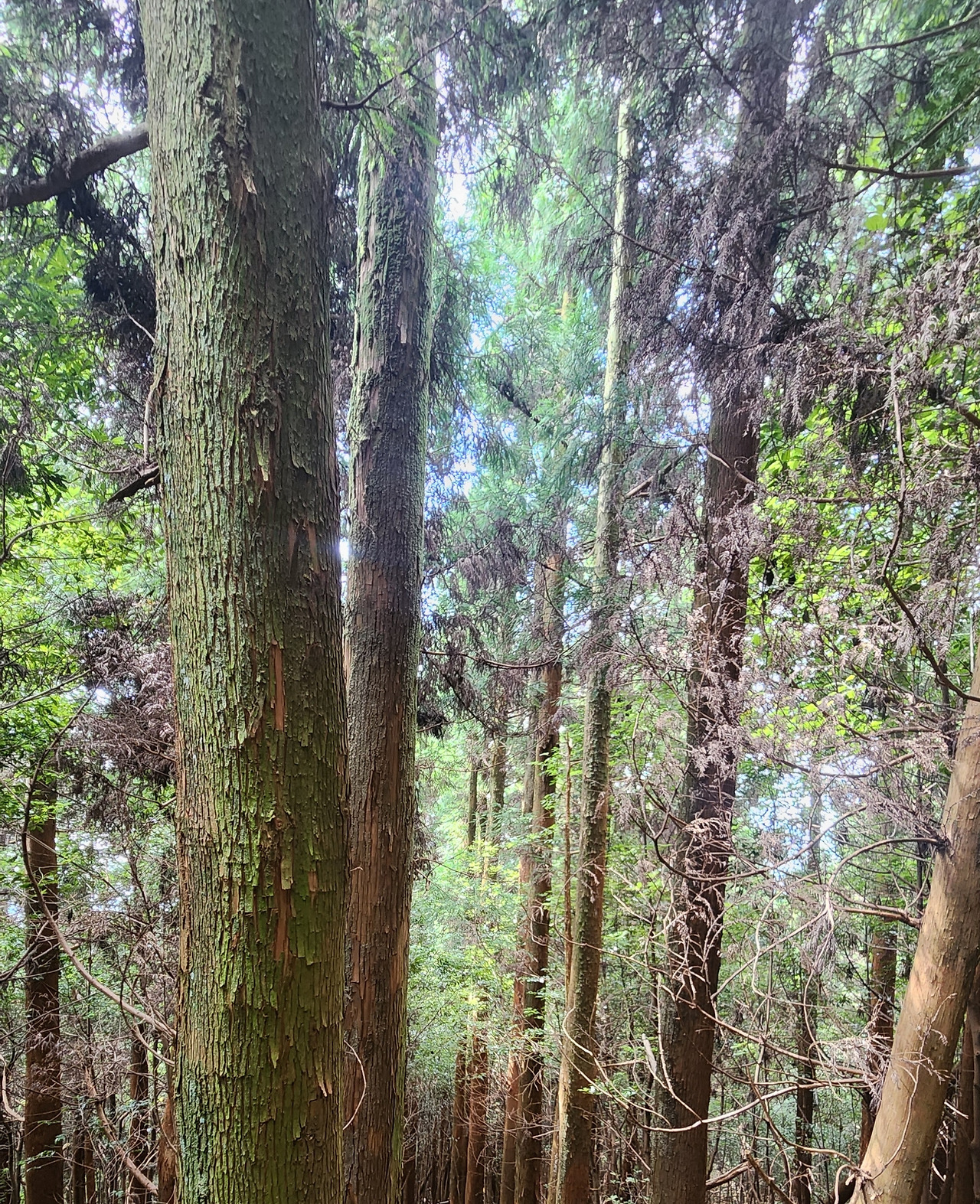능선을 따라 산을 내려가면 오를 때는 힘들어서 보이지 않았던 삼나무숲이 달리 보이기 시작한다. 그제서야 영화에서 순이와 철수가 눈물로 이별하던 곳이 눈에 들어온다. <늑대소년> 촬영지는 바로 이곳이다. 영화 중반을 넘어서면서부터 순이와 철수는 쫓기는 신세가 된다. 철수에게 남다른 출생 배경이 있기 때문인데, 그들을 뒤쫓는 군인과 마을 사람들은 목소리만 들릴 뿐 삼나무숲에 가려 보이지 않았다. 삼나무가 이들을 잠시 가려주는 동안 순이는 철수에게 모진 말을 해대며 헤어지자고 했다. 순이 입장에서는 그것이 철수를 지킬 수 있는 마지막 방법이었다. 반면 그렇게 따르던 순이에게 느닷없이 뺨을 맞은 철수는, 잘못 하나 한 것 없이 이곳에서 생이별까지 감내해야 했다. 영화를 떠올리며 잠시 숨을 고르며 서 있자니 삼나무숲 깊숙한 곳 어디서 억울한 늑대 울음소리가 들려올 것만 같았다. 설령 정말 늑대가 나타난다 하더라도 하나도 이상하지 않을 곳이었다.