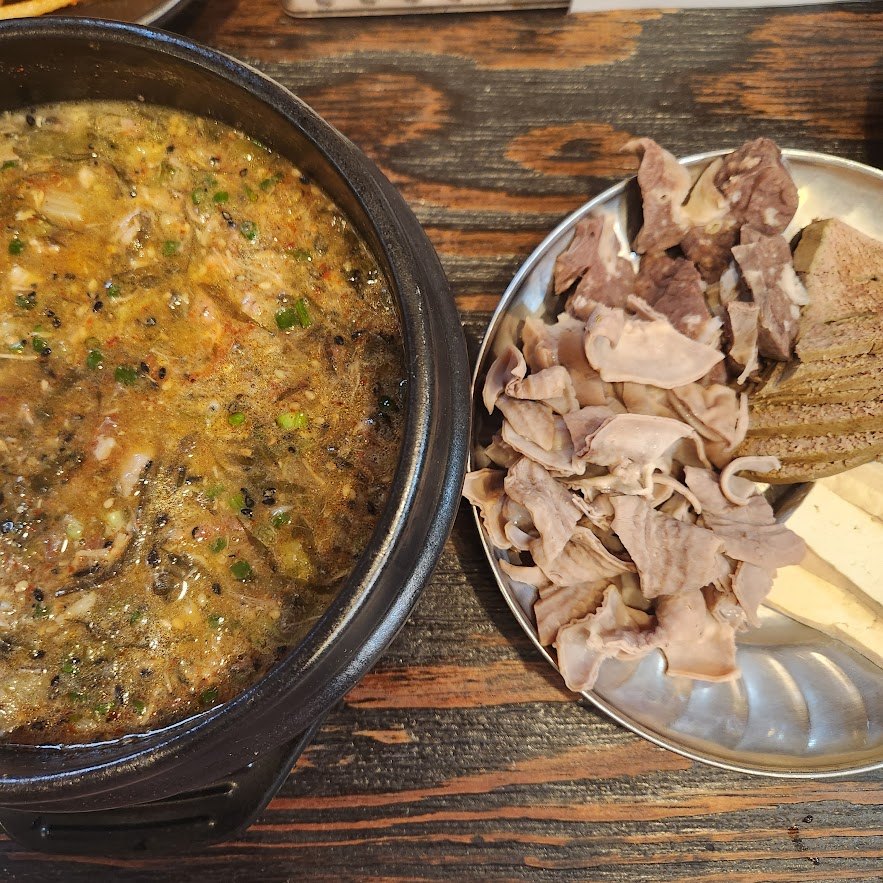 대정 쪽 '강셰프의 키친'에서 먹어 본 몸국은 된장 맛이 깊었다. 제주시청 '호근동' 몸국은 기름지고 가게 분위기가 좋았다. 여긴 정확한 맛이다. 제주 몸국 하면 상상하는 맛 그대로다. 육수가 깊고 된장을 넣어 맞춘 간이 딱 맞다. 몸이 적당히 들어가 있어서 국물도 여유있다. 더 맛있는 건 같이 나온 내장이다. 잡내 하나도 없이 간간하면서 질기지 않고 식감이 부드럽다. 혼자 먹기 아쉬운 맛이다. 사람 입맛이 크게 다르지 않은지 포털에서 제공하는 가게 후기도 좋다. 가게는 들어올 때만해도 한산했는데 나갈 때 보니 제법 사람이 찼다. 혼자 먹을 수 있는 테이블도 있어 제주시와 숙소가 가까운 여행객에게 추천한다.