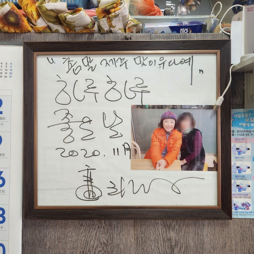 '정의고을 꿩메밀칼국수'에는 배우 사인이 딱 한 장 붙어 있었다. 배우 고두심 사인이다. 사인에다가 이렇게 써두셨다. "참말 제주 맛이우다예." 다른 유명인 사인이 아무리 많은 식당이더라도, 제주도에서는 이 사인 한 장만한 게 없는 것 같다. 보증인이 다른 사람도 아니고 제주도에서 나고 자란 고두심 선생님이니 믿고 먹을 수 있다. 음식 자체가 취향에 안 맞으면 몰라도 요리 못하는 가게는 아니라는 뜻이다. 주문한 꿩메밀칼국수 한 그릇을 받고 나름 평소보다 더 진지하게 맛을 본다. 진한 국물과 면발을 숟가락으로 떠 후루룩 먹으니 든든한 국밥 한 끼를 먹는 기분이다. 동문시장 골목식당에서 먹었던 메밀꿩칼국수와 편차가 거의 없는 깊은 맛이다. 무엇보다 영화 촬영지 제주 답사를 마치는 마지막 식사를 고두심 선생님 다녀간 식당에서 할 수 있어 좋았다.