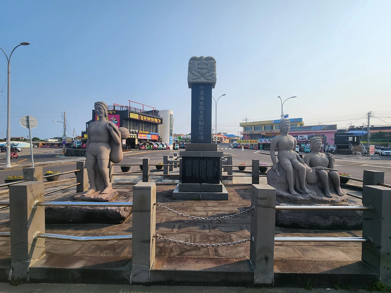 도현을 따라 자판기 커피 한 잔 뽑아볼까 했지만 그러지는 못했다. 영화 속에서 천진항 대합실이 있던 자리에는 이제 해녀상이 자리잡고 있다. 도로를 회전교차로로 정비하면서 대합실도 옮겨 새로 지은 모양이었다. 해녀상에도 사연이 깊다. 1920년대 일제는 우뭇가사리나 미역 같은 해초를 사실상 빼앗다시피 했다. 해녀들은 자신들의 것을 지키기 위해 일제에 맞섰다. 1931년부터 이듬해까지 집회에 나선 해녀들이 1만 7000명이 넘었다. 이를 '제주해녀항일운동'이라고 부른다. 제주 3대 항일운동 중 하나이다. 천진항에 있는 해녀상은 이 '제주해녀항일운동'을 기리고 있다.