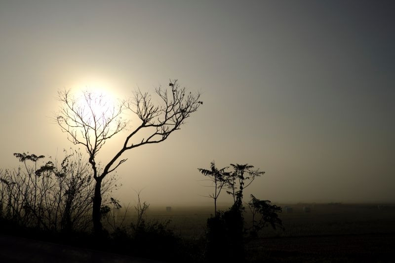 제방 옆 도로로 내려갔다. 차가 제법 많이 지나쳐 길옆에 서 있기 부담스러웠다. 조금 걸어 보는데, 문득 눈에 들어오는 풍경이 있었다. 앙상한 가지에 걸려 있는 커다란 태양의 모습이었다. 적당히 낀 안개가 어우러진 모습이 몽환적으로 느껴졌다. 지나가는 차를 피해 조심스럽게 카메라를 들고 그 모습을 담았다. 태양의 옅은 붉은 기가 없었다면 영락없는 흑백사진이었다.