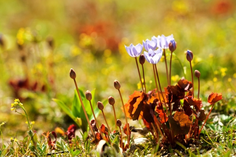 땅에서 피어난 키 작은 봄꽃 중 가장 화려한 꽃을 들라면 단연, ‘깽깽이풀’이다. 잎보다 먼저 올라온 꽃대에서 폭 2cm가량의 보라색 꽃을 피운다. 가는 꽃대에서 올라와 하늘거리는 모습이 가냘프다 생각되는 꽃이다. 미모만큼이나 만나기도 쉽지 않아, 환경부에서 멸종위기종으로 지정해 보호 중인 귀한 몸이기도 하다.