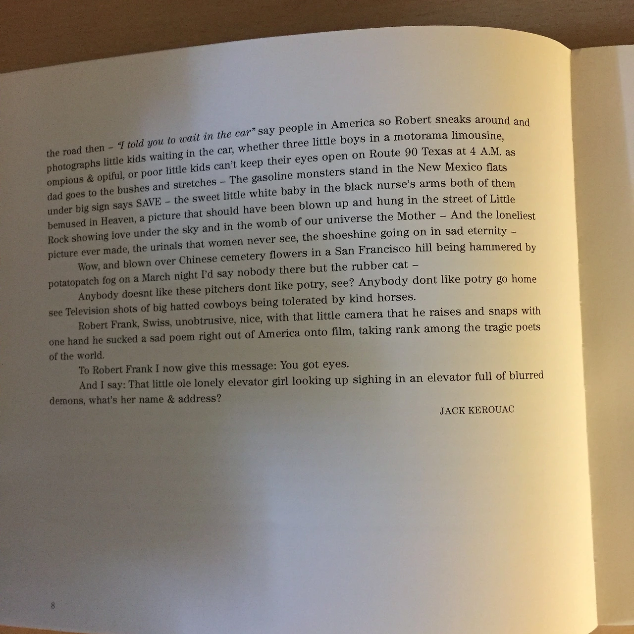 이 책은 현대 다큐멘터리 사진의 개념을 바꿨다는 평을 받는 사진가 로버트 프랭크의 출세작이다. 서문은 비트 제너레이션을 대변하던 작가들 중 하나인 잭 케루악이 썼다. 요즘의 추천사처럼 꽤 유머러스하다. ("네가 찍은 그 엘리베이터의 여자, 전화번호 좀 알려줘"란 말로 끝나는 추천사) 1986년에 출간된 이후로 지금까지 꾸준하게 재판본이 나오는 스테디셀러. 이걸 결제할 때는 최신본이 있는 줄 몰랐다..... =_= 그게 더 저렴함... 초판본이라는 거 외에는 큰 매리트 없음. 책장을 열 때마다 옛날 종이 냄새가 난다. 기관지가 걱정되지만 여기엔 뭐 불만은 없음. ㅋ