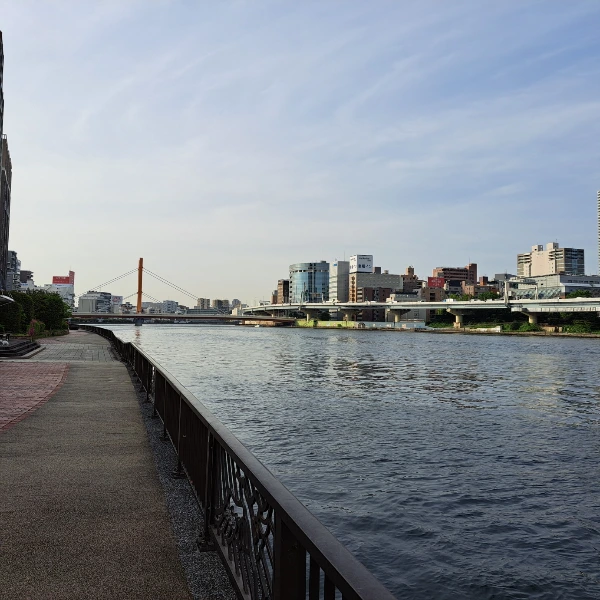 아사쿠사까지는 스카이트리에서 한 정거장. 걸었다. 도쿄 어디를 걸어도 보도가 울퉁불퉁하지 않다. 평평하고 반듯하다. 빈틈이 없고 폭신폭신하다. 기분이 좋다. 다리를 건너는데 스미다 강이 파란 하늘 아래 유유히 흐른다. 힐링이다.
