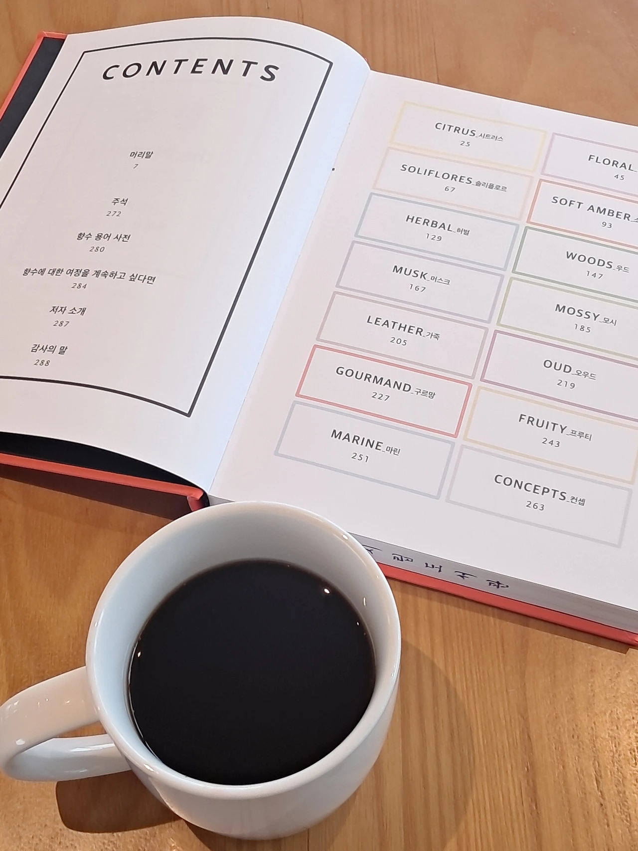 주머니에 책, 향수 그리고 향기가 들어 있다.