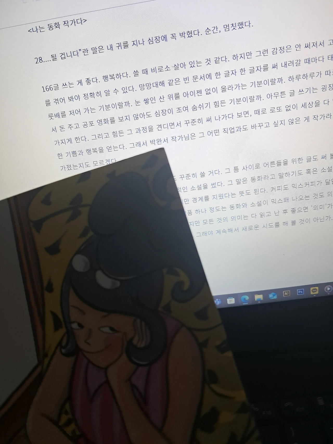 166 글 쓰는 게 좋다. 행복하다. 쓸 때 비로소 살아 있는 것 같다. 하지만 그런 감정은 안 써져서 고통스러울 때를 겪어 봐야 정확히 알 수 있다. 망망대해 같은 빈 문서에 한 글자 한 글자를 써 내려갈 때마다 태평양에서 나룻배를 저어 가는 기분이랄까. 눈 쌓인 산 위를 아이젠 없이 올라가는 기분이랄까. 하루하루가 따로 영화관에서 돈 주고 공포 영화를 보지 않아도 심장이 조여 숨쉬기 힘든 기분이랄까. 아무튼 글 쓰기는 굉장한 인내심을 가지게 한다. 그리고 힘든 그 과정을 견디면서 꾸준히 써 나가다 보면, 때로 로또 없이 세상을 다 얻은 듯 충만한 기쁨과 행복을 얻는다. 그래서 박완서 작가님은 그 어떤 직업과도 바꾸고 싶지 않은 게 작가라고 자부심을 가졌는지도 모르겠다.