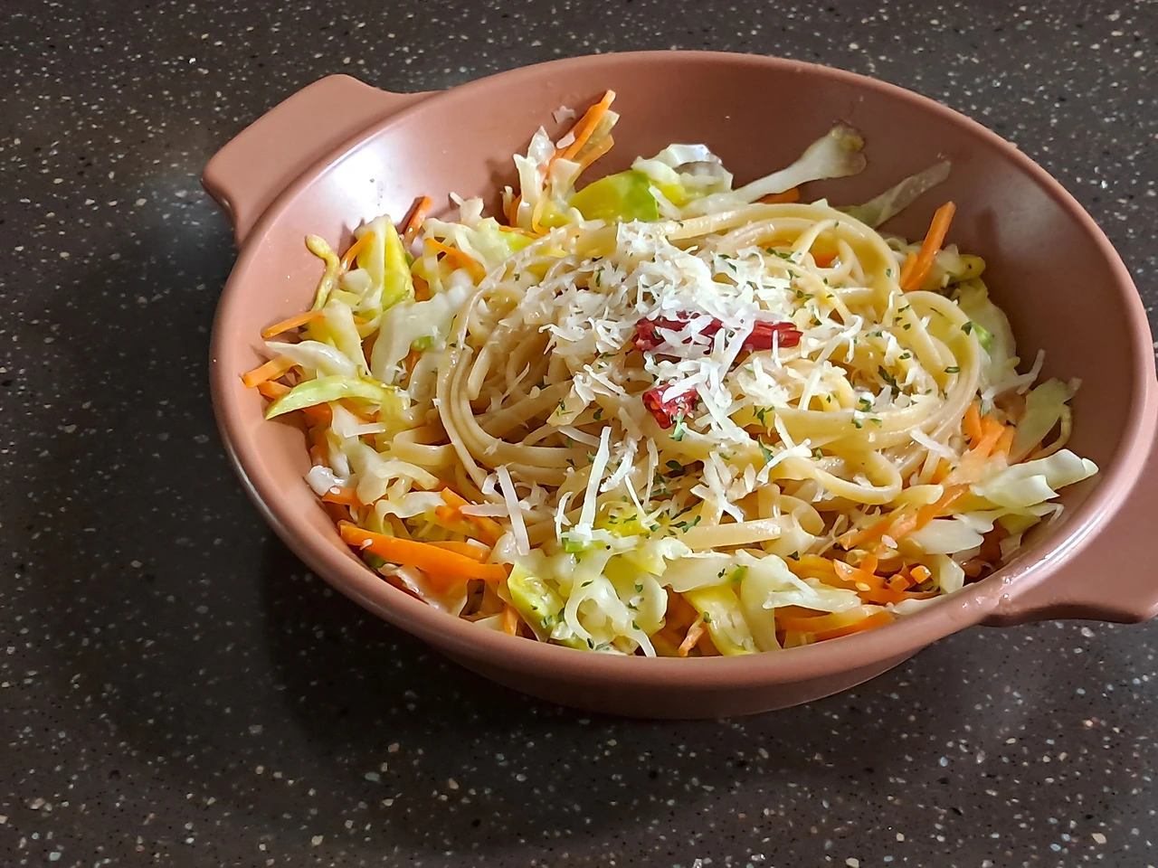 치즈를 갈아 올리고, 파슬리 가루를 톡톡 뿌려 맛있게 먹는다.