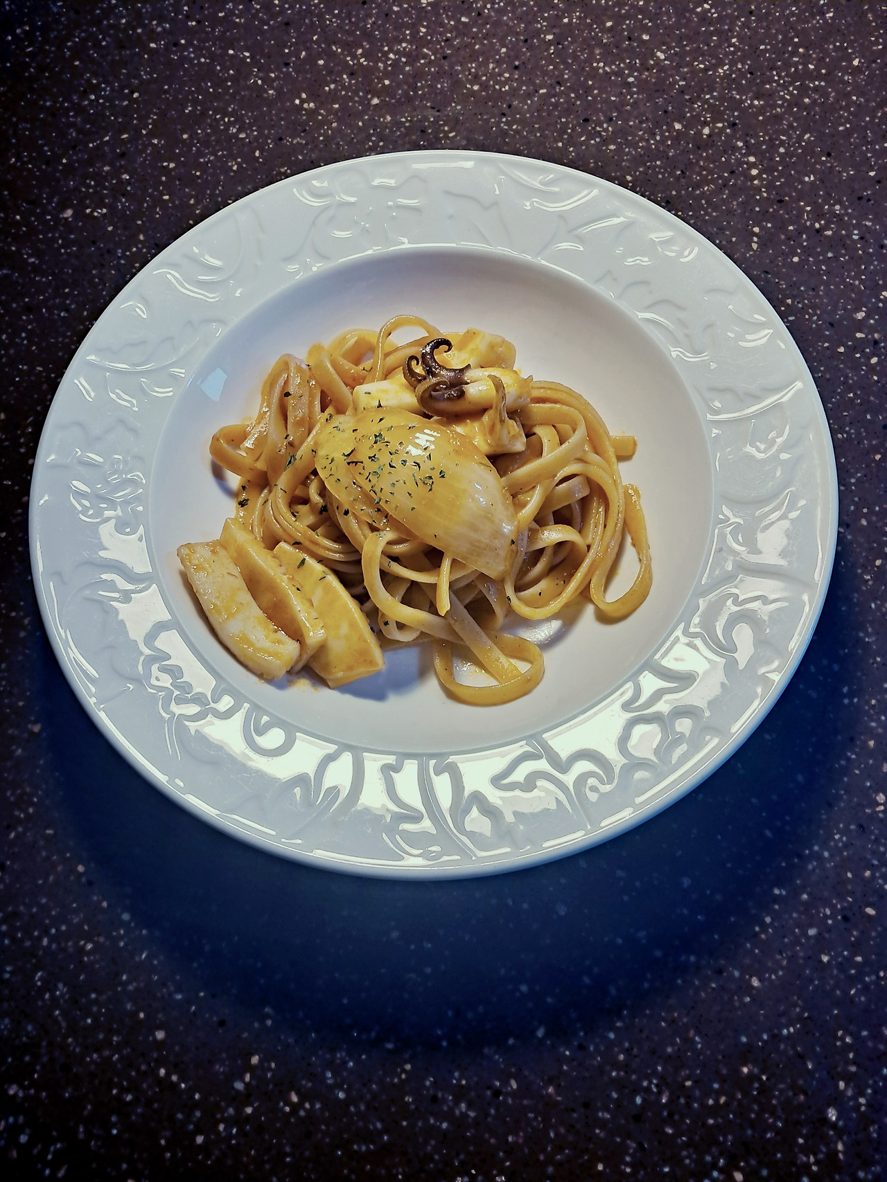 알단테 즘으로 익힌 링귀니 면을 양파와 마늘, 갑오징어를 올리브오일과 볶아 넣은 토마토소스에 살짝 볶아낸다. 남은 토마토 파스타를 저녁에 물을 살짝 넣어 뚜껑을 닫아 온기를 입혀 다시 먹으니 아침보다 맛있다. '링귀니면은 알단테는 아니구나.'하며