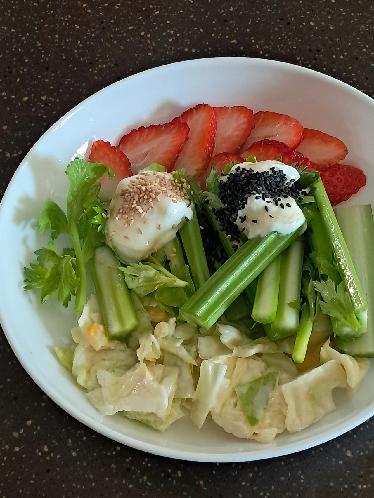 무가당 그릭 요구르트를 숟가락으로 두 번 툭툭 떨구어놓고 꿀을 딸기에 요구르트에 소스통 꿀통으로 편하게 초옥 뿌린 후, 참깨 검은깨 1ts를 뿌려내 맛있게 먹는다.