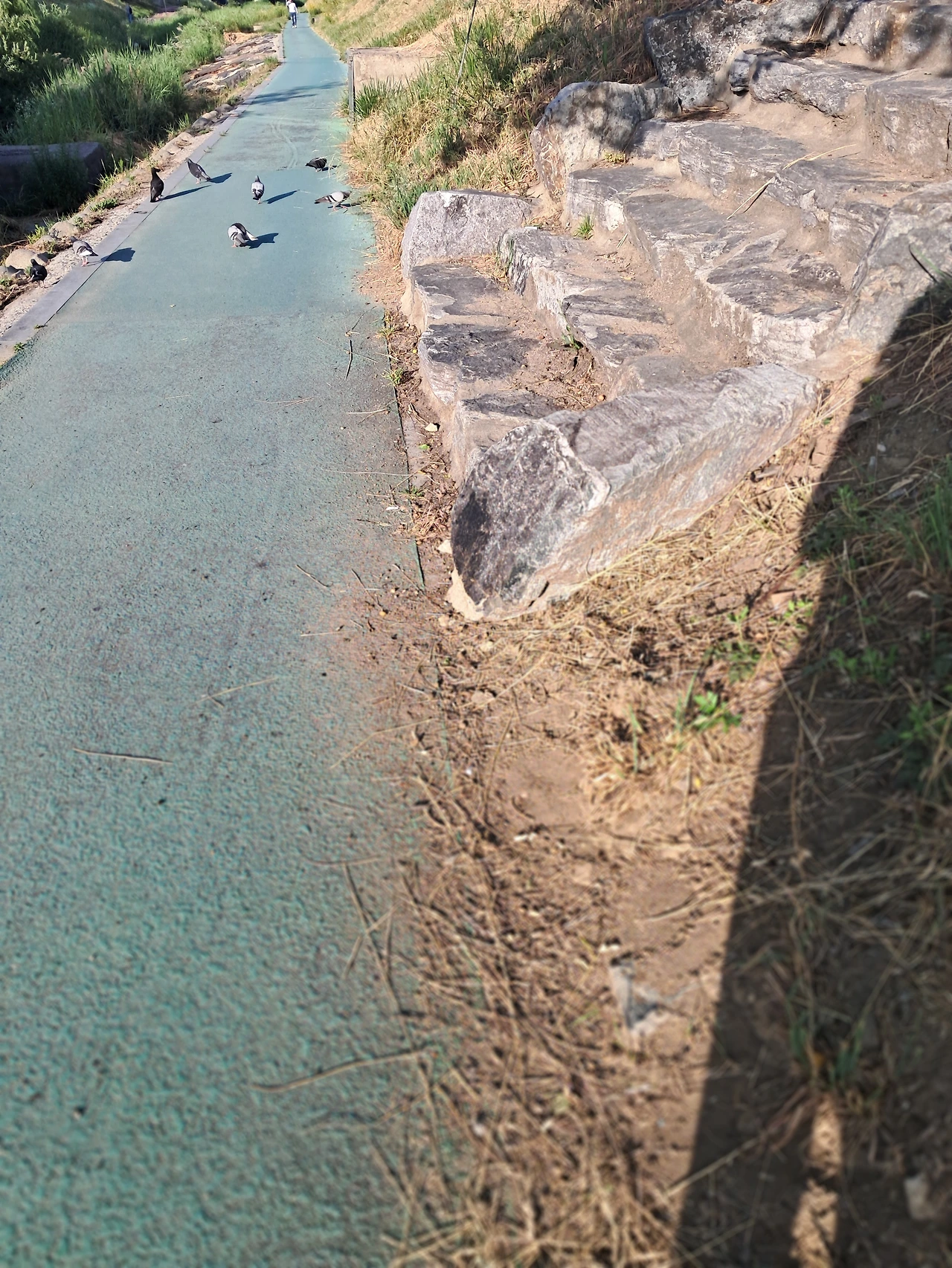 비둘기가 날아가지 않게 살살 걸어 지나간다.