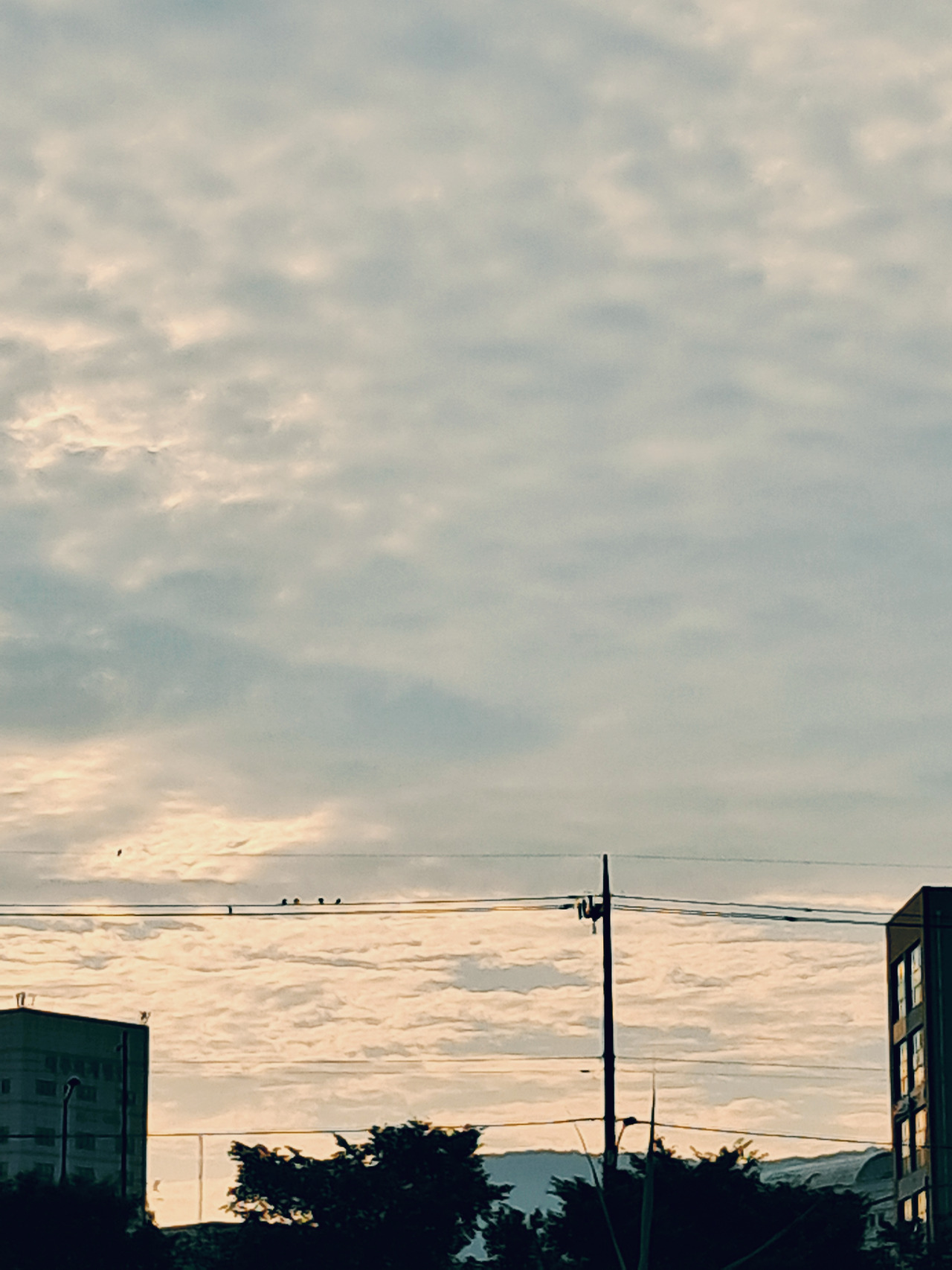 6시와 7시 사이, 구름 햇빛을 뒤로 높은 전선줄에 새들이 앉았다.
