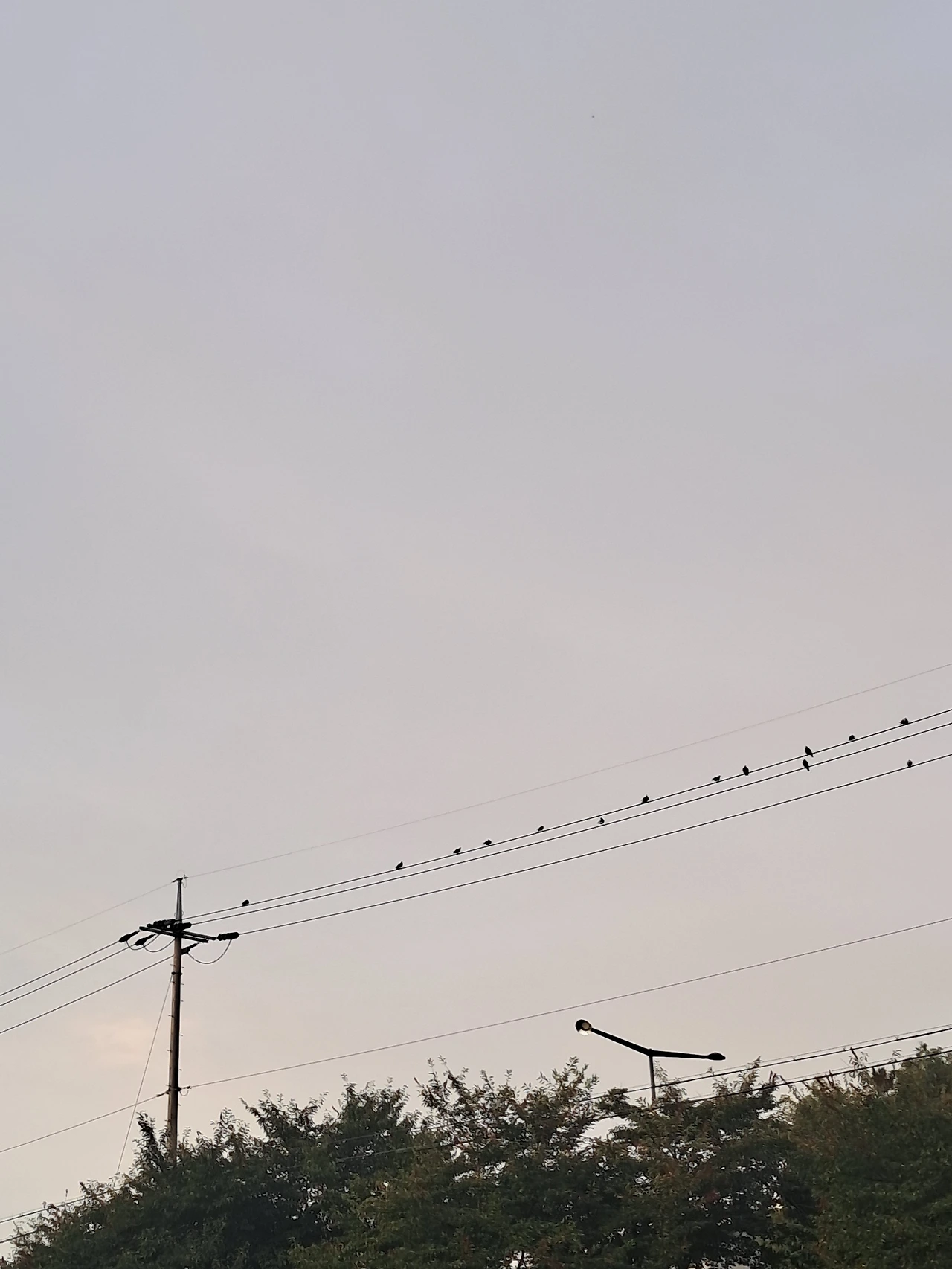 아침 6시와 7시 사이를 걸으면 날아드는 순간, 앉은 새와 막 앉은 새 열 네마리가 여름 끝 구름을 뒤로하고 전선위에 쪼르르 날아와 앉았다. 계속 앉았던 것처럼.