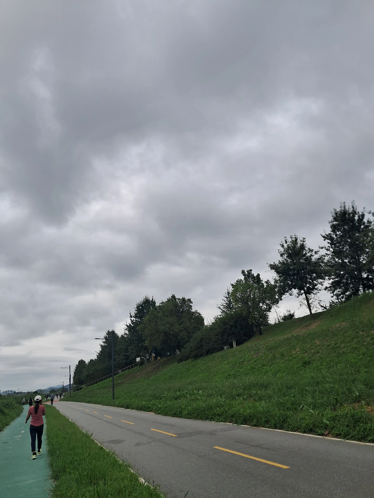 걷기 시작할 때 보이던 들리던 풀, 물, 바람, 아침 햇빛도 여전히 걷는데 중요한 요소가 되는데, 거기에 더해져 이 아침에 나가면 사람들이 걷고 뛰고 자전거 타고 있어 비등하게 걷고 싶어지는 시각적 요소로 중요해졌다.