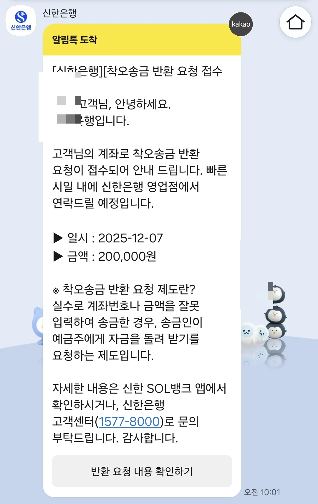 일하는 중이라 자세히 못 보고 근무 후 확인을 다시 해야 했어요. 그 사이에 다시 한번 카카오톡으로도 오입금으로 인한 반환금 요청에 대한 동의를 하시겠냐고 하겠으면 직접 은행 사이트에서 동의해 달라고 내용이 적혀있습니다.