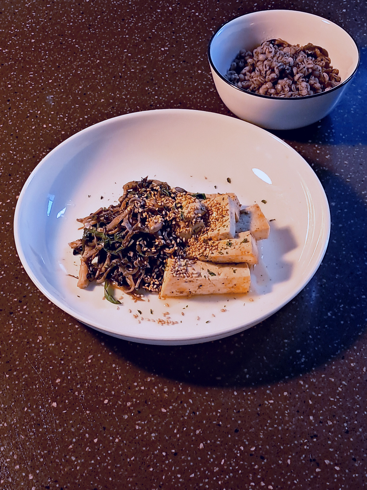냉장고를 열어보니 두부, 깻잎, 양배추, 말려 굽다시피 한 느타리버섯이 보인다. 양배추를 삶으려다가 다 자는데 시끄러울 것 같아서 두부, 깻잎, 굽다시피 느타리버섯을 꺼냈다.