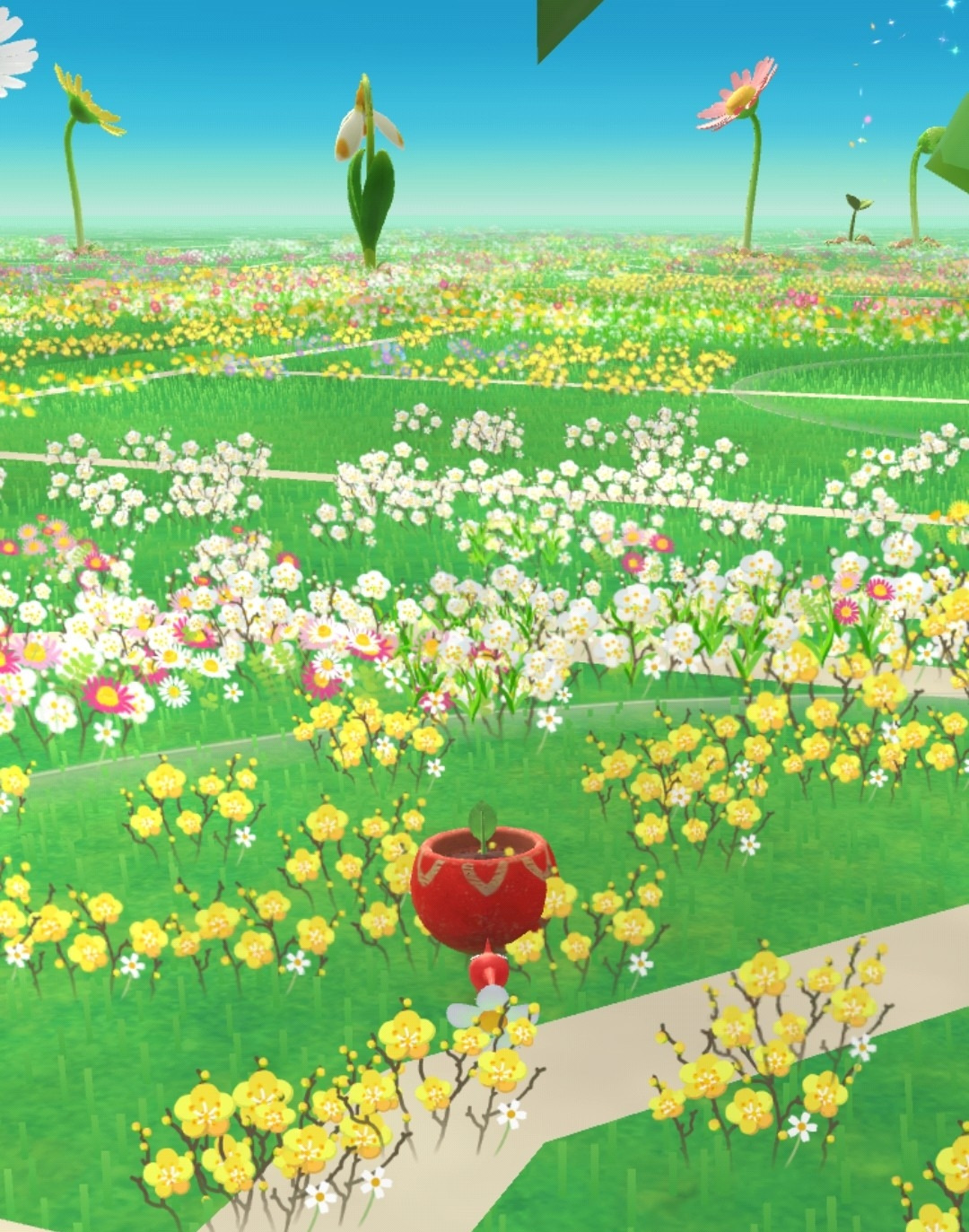 피크민들 먹이인 정수를 주면 머리에서 꽃이 피는데 이걸 따서 꽃잎을 모은 뒤 꽃심기 버튼을 눌러서 산책하며 꽃을 심는다.