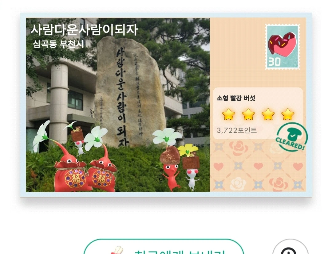레벨 좀 올리고 버섯전투 참가하면 전투에 참가했던 피크민들이 그 장소의 엽서를 가져오는데 엽서는 친구들이랑 주고받는 용도로 사용된다