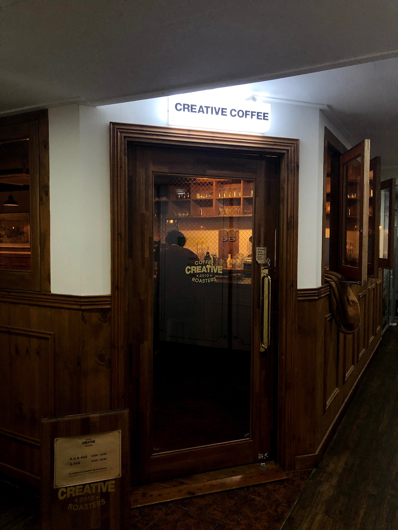 술집과 식당이 즐비한 건물 4층 한편에 크리에이티브커피가 있다. 건물 4층에 카페가 뭐 그리 의외일까 싶지만 이 곳은 바깥에서 보이지 않는 방면에 창이 있다. 즉 밖에서 보면 홍보할만한 수단이 사라진 장소에 있다.