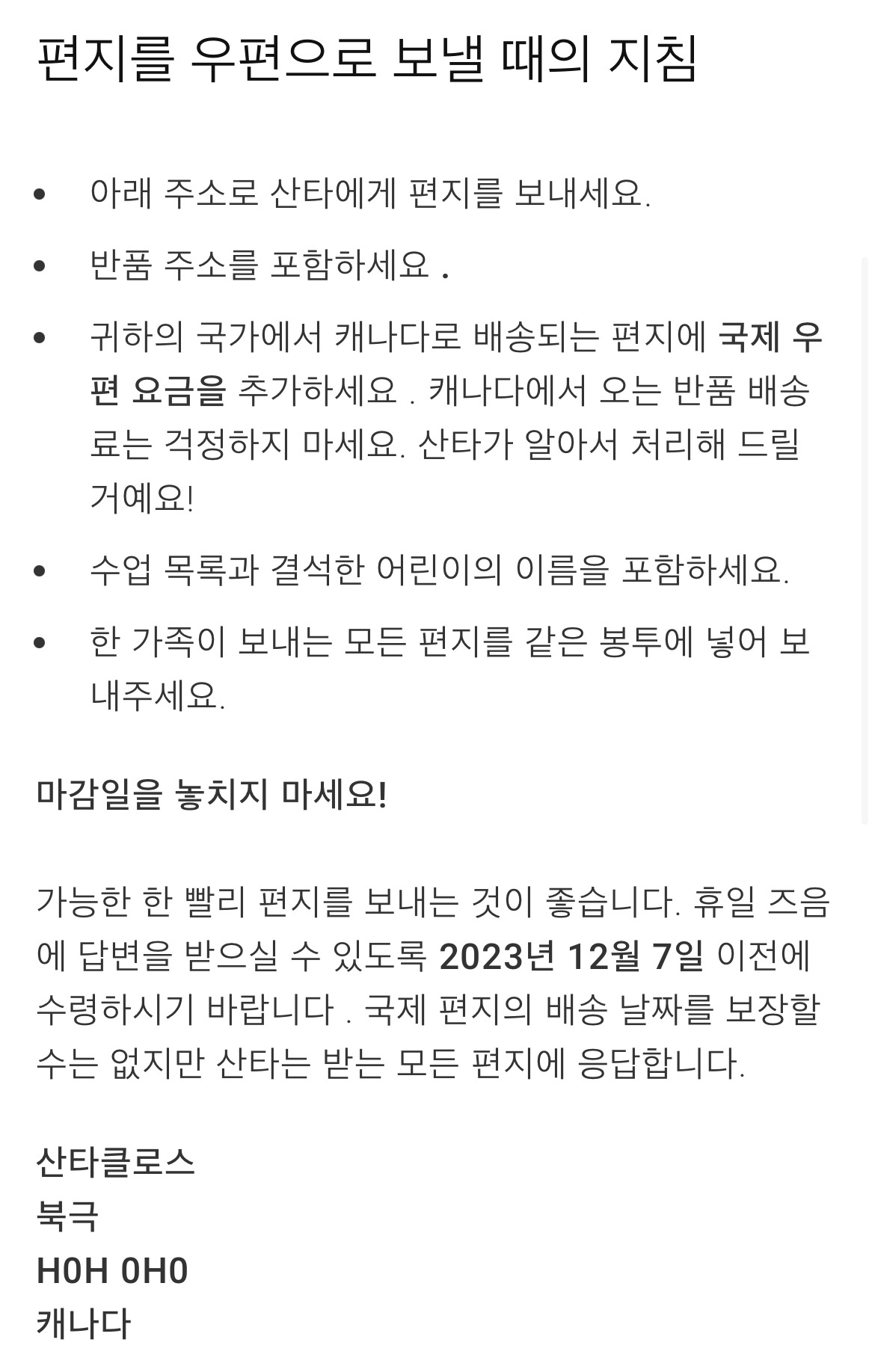 더군다나 캐나다 내에서 위 주소로 보내는 편지는 우표 없이도 발송된다니 아이들에게 직접 써서 편지봉투에 담아 우체통에 넣는 추억까지 선사할 수 있는 좋은 기회가 아닐 수 없다.