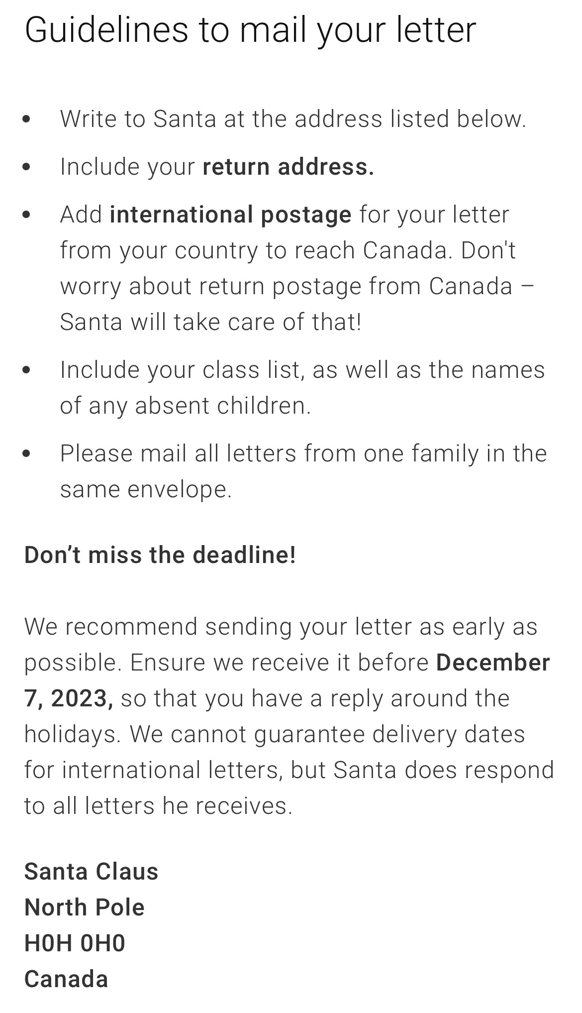 we will deliver Santa's reply around the world. We cannot guarantee delivery dates for international letters, but Santa does respond to all letters he receives in the same language.