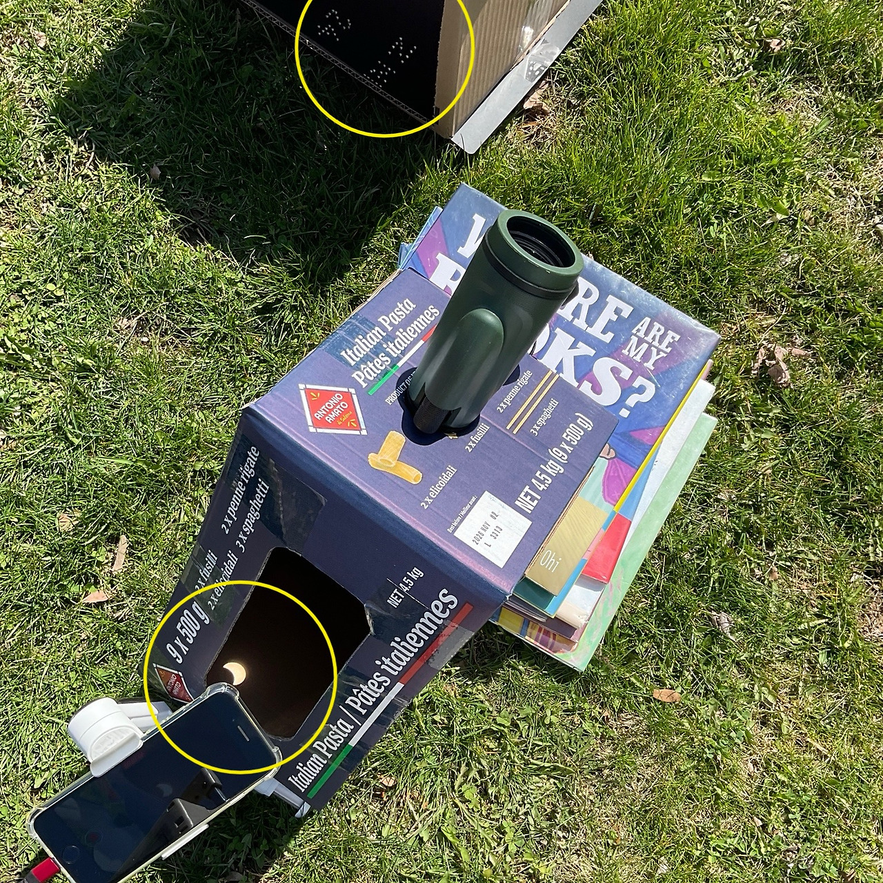 예전에 사봤지만 쓸모없었던 핸드폰용 망원렌즈는 박스에 꽂아 태양그림자를 만들었다.