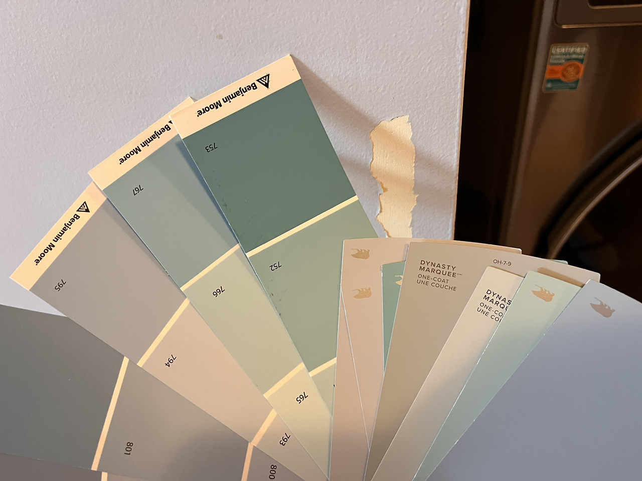 그냥 내버려 두기엔 너무 티가 났고, 혹시나 이걸 빌미로 몇백 불 차감당할까 걱정돼 인근 Home Depot와 Benjamin Moore 매장에 페인트 색상 샘플을 받으러 들렀는데, 벗겨진 페인트 조각을 가져오면 함께 찾아봐준단다.