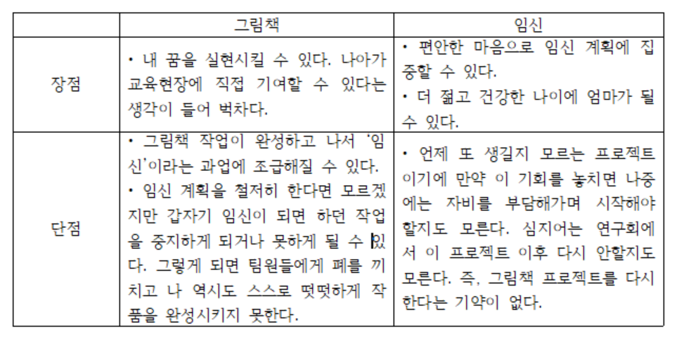 두 가지 선택 - ‘임신’이냐 ‘그림책’ 출산이냐- 은 각각 장점과 단점이 뚜렷했다.