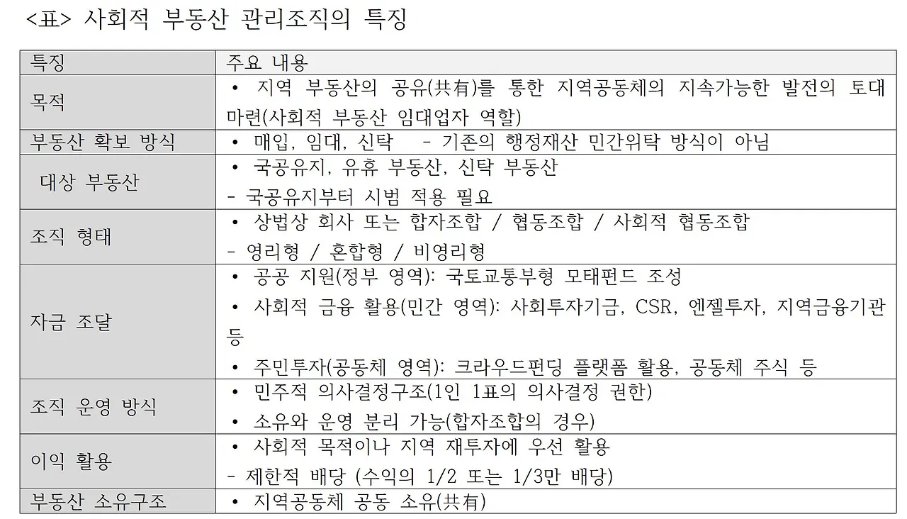 이 보고서는 사회적 부동산관리조직을 “지역공동체가 부동산을 소유하고 운영하는 부동산 임대 및 운영조직”이라고 정의한다. 또 “지역공동체가 사회적 목적을 가진 부동산의 소유·운영자가 되어 사회적 임대업자의 역할을 함으로써 지역 주체들의 활발한 활동을 지원하는 기반을 만들 수 있다”고 평가했다.