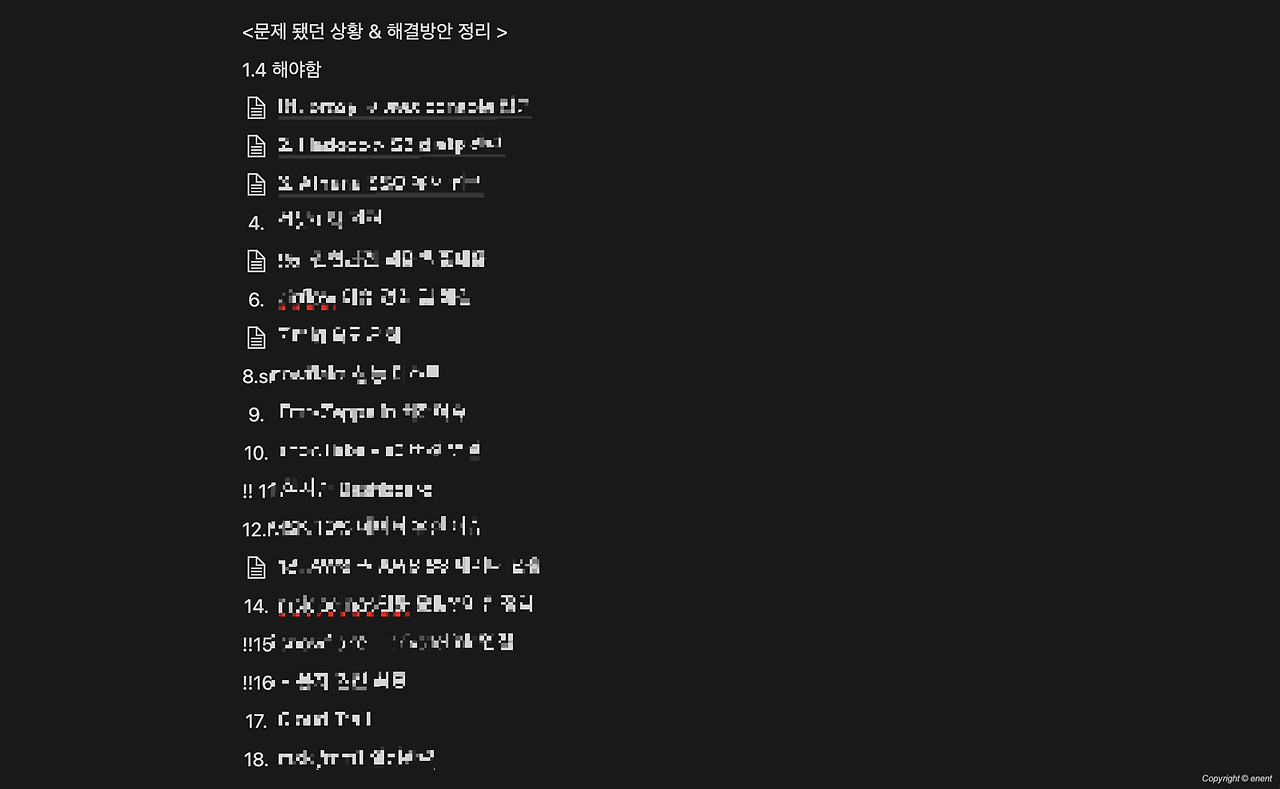올 해에도 운이 좋게 프로젝트 참여 멤버가 되면서, 또 직접 아키텍처와 실시간 플로우를 개발할 수 있는 기회가 생기면서 정말 많은 것들을 했고 배웠고 또 배울 예정이다. 작년에 느낀 거지만 어떤 문제가 있었고 어떻게 해결을 했는지 그때그때 정리해 두지 않으면 내가 그간 투자한 시간들과 했던 고생들이 물거품이 된다. 물론 체화된 경험이 존재하겠지만 그래도 같은 상황이 닥쳤을 때 같은 힘든 과정을 겪지 않고 조금 더 빠른 해결을 할 수 있고, 나은 해결방법을 제안할 수 있다는 점에서 시간이 소요되는 작업이지만 시간을 내서 꼭 해야 하는 작업이라 생각한다. 노션에 간단한 과정들을 정리하고 있는데, 보다시피 올해 18개의 리스트 중 채워진 건(앞에 아이콘이 생겨 있는 것) 6개뿐이다. 나머지는 7-8월의 나에게 또 미뤄본다. 미안..
