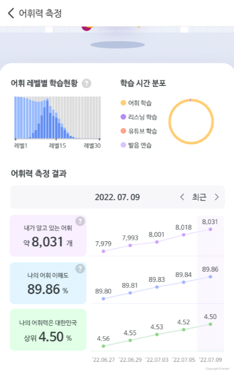 '말해보카'라는 어플을 유용하게 사용 중인데, 2월부터 하여 반복을 포함하여 12600 단어(표현), Distinct 기준으로는 4000개 단어(표현) 정도 학습했다. 이 중에 몰랐던 단어(표현)는 2300개 되는 것 같다. 사실 내가 뭐라고 왈가왈부하겠느냐만은, 어느 정도 문법이 잡히면 그 이후부턴 단어 싸움이라는 게 맞는 것 같다. 특히나 구동사들을 많이 알게 되면서 들었을 때 바로 해석되는 표현도 많아지고 말할 수 있는 표현도 많이 늘어났다.