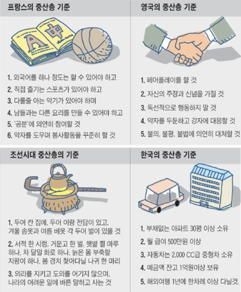 연장선으로 우리나라 중산층의 기준과 다른 나라의 중산층의 기준을 돌아보면 확연한 차이를 느낄 수 있다.