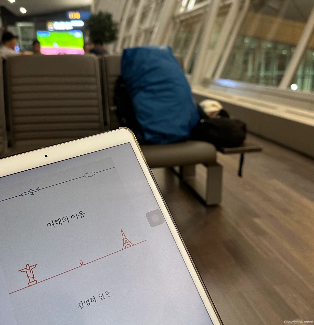 물론 장소의 영향이 한몫했을 거다. 비행기를 옆에 두고 백여 명이 넘는 사람들의 설렘이 가득모인 공항 창가에서. 그리고 컴컴한 비행기 안, 외부와 연결된 공간으론 작은 타원형의 창 하나뿐인 곳에서 달달한 와인을 한 모금 마시고 힐끗힐끗 창문을 보며 읽는 여행책은 이 상황 자체만으로 작가와 한 몸이 된 듯한 느낌을 받는다.