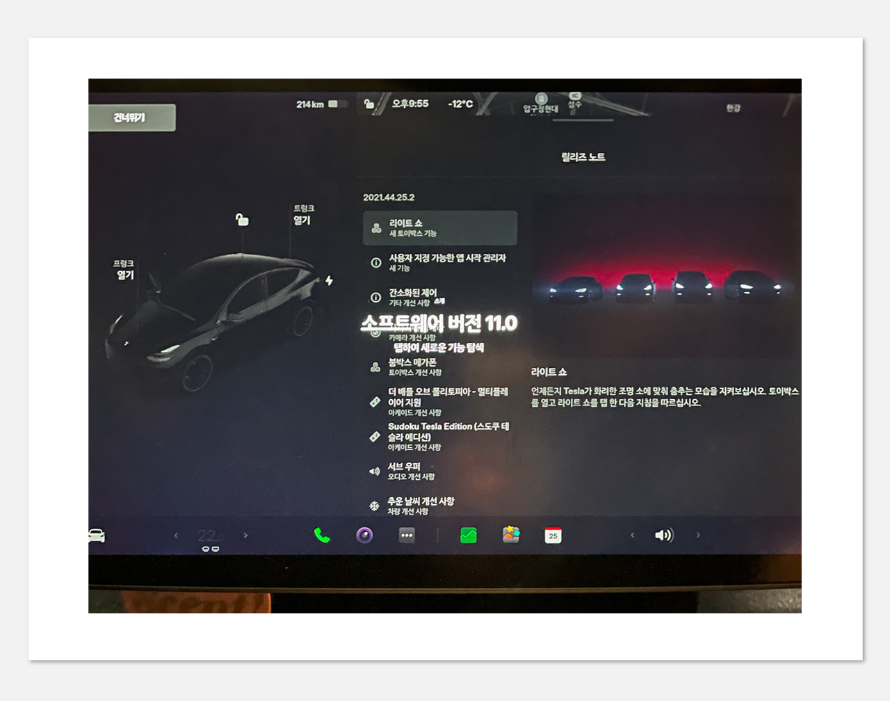 테슬라를 처음 인도받았던 2020년 2월, 대충 이런 설명을 들을 수 있었다. “테슬라는 계속해서 바뀌는 자동차입니다.” 4년간 테슬라를 이용하면서 많은 부분에서 그 말에 대한 공감을 하고 있다. 테슬라는 하나의 디지털 프로덕트 같다는 느낌을 많이 받는다. 짧게는 2주에서 길게는 한 달에 한 번씩은 업데이트를 할 때마다 계속해서 기능이 업데이트된다.