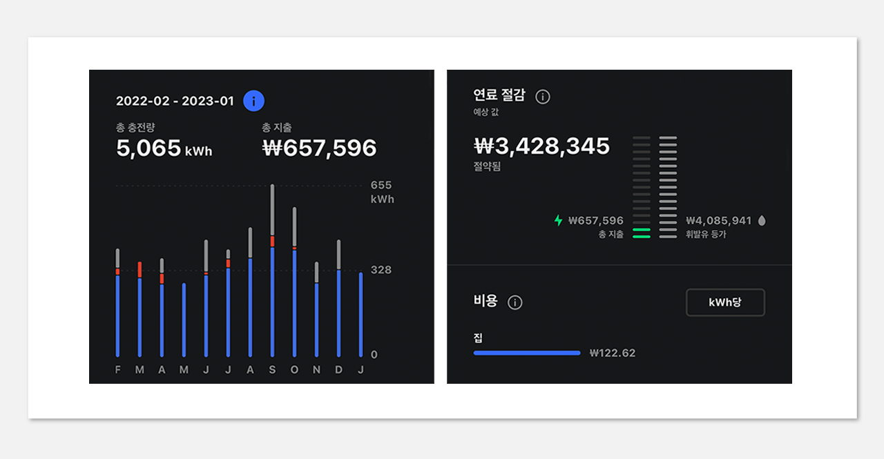 최근에 업데이트된 앱에서는 테슬라를 충전했을 때 사용되었던 비용과 대한민국 평균 휘발유 비용과의 비교를 통해 내가 얼마나 많은 연료를 절감해 볼 수 있는 경험을 제공하기 시작했다.