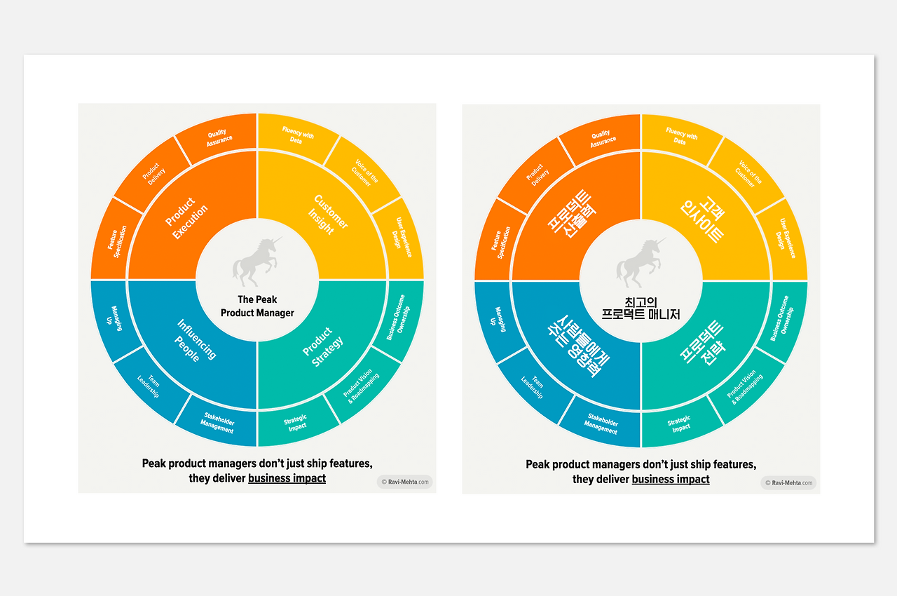 표에서는 크게 네 가지(프로덕트 산출력, 고객 인사이트, 사람들에게 주는 영향력, 프로덕트 전략)를 기준으로 스킬을 크게 구분하고 항목별로 3가지 정도의 세부 능력들을 이야기하고 있습니다.