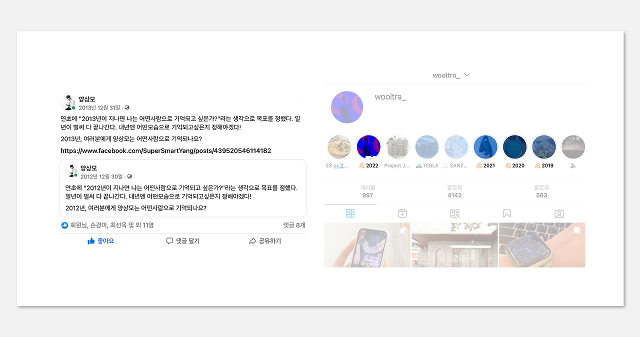 2012년부터 12년째 꾸준히 1년 단위로 목표를 세우고 움직였다. 연초(현재의 나)에는 연말에 내가 어떤 사람이 되었으면 좋겠는지를 설정하고(미래의 나), 또 내가 그런 모습으로 보였는지를(다른 사람들에게 보여지는 나) 확인했다.