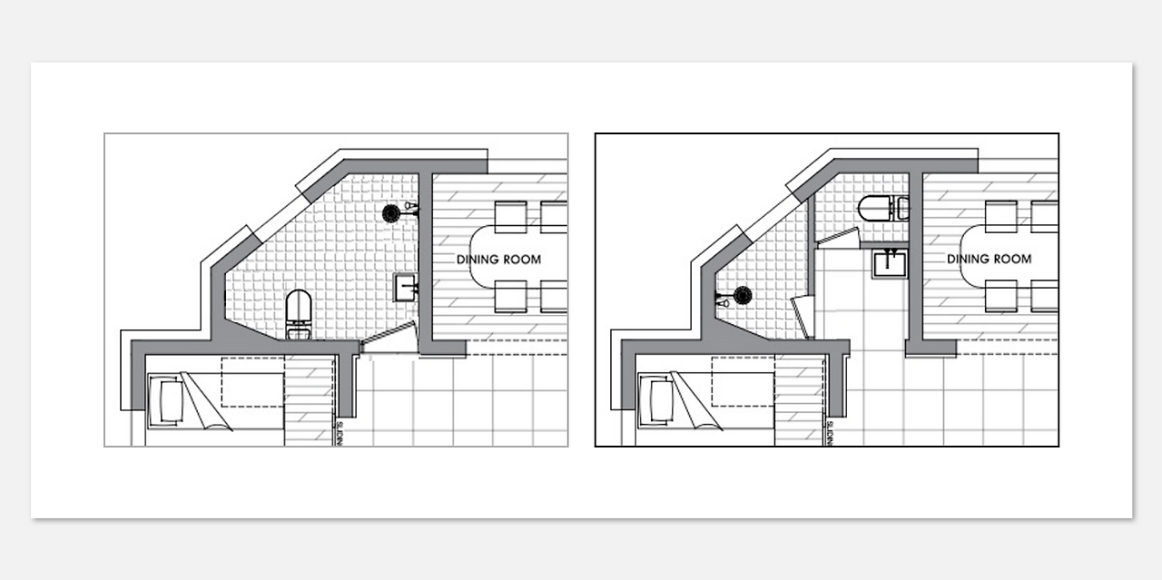 다락 공간을 없애고 나니 화장실의 천고가 높아졌고, 다시 보니 작았던 화장실이 더 넓어 보이는 느낌이 들었습니다. 그렇게 공간이 넓어 보이자 뭔가 좀 더 효율적인 화장실을 구성할 수 있을 것 같다는 확신이 들었습니다.